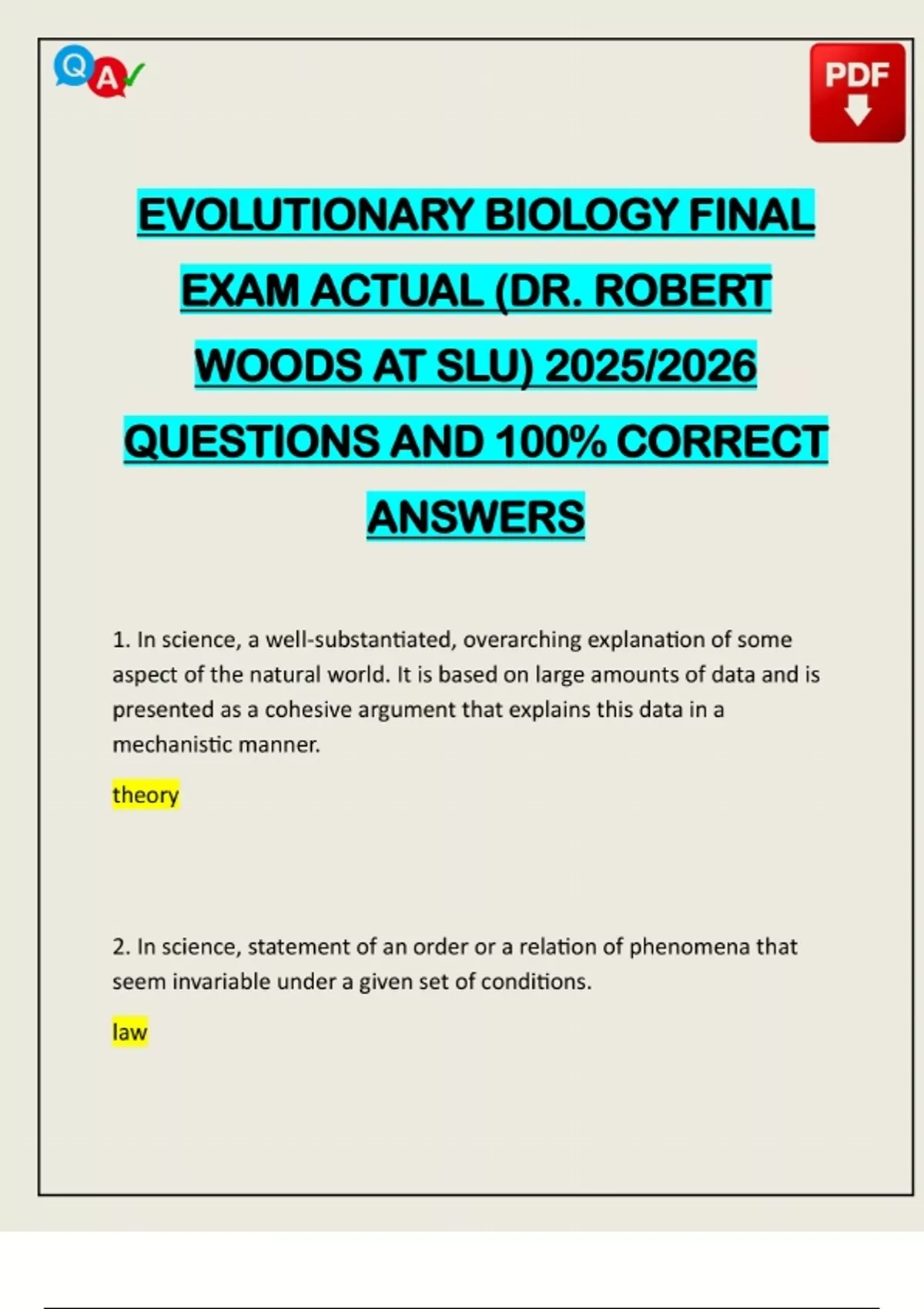 EVOLUTIONARY BIOLOGY FINAL EXAM ACTUAL (DR. ROBERT WOODS AT SLU) 2025/2026 QUESTIONS AND 100% CORRECT ANSWERS 1. In science, a well-substantiated, overarching explanation of some aspect of the natural world. It is based on large amounts of data and is presented as a cohesive argument that explains this data in a mechanistic manner. theory 2. In science, statement of an order or a relation of phenomena that seem invariable under a given set of conditions. lawNeed assistance in Online classes, Exams & Assignments? Reach out for Full Course Assistance, Plagiarism-free Essay Writing, Research Paper & Discussion Posts. Confidential & Secure! Email now at: 3. An observation that has been repeatedly confirmed. For example, there are 23 pairs of chromosomes in human cells. fact 4. A testable statement about the natural world that can be used to build more complex inferences and explanations. It explains why something occurs. hypothesis 5. School of geological thought assuming that geological phenomena were the product of a consistent set of natural forces operating on the planet over very long periods of time. uniformitarianism6. The dominant view of species prior to Darwin's work was that species were: unchanging 7. In the logic of science, the process of reasoning from a part to the whole, or from particular instances