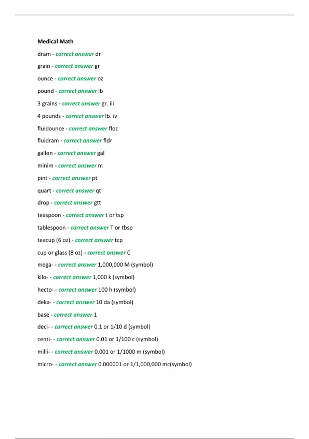 Medical Math dram - correct answer dr grain - correct answer gr ounce - correct answer oz pound - correct answer lb 3 grains - correct answer gr. iii 4 pounds - correct answer lb. iv fluidounce - correct answer floz fluidram - correct answer fldr gallon - correct answer gal minim - correct answer m pint - correct answer