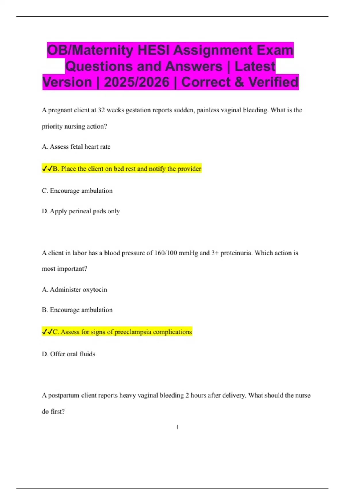 OB/Maternity HESI Assignment Exam Questions and Answers | Latest Version | 2025/2026 | Correct & Verified A pregnant client at 32 weeks gestation reports sudden, painless vaginal bleeding. What is the priority nursing action? A. Assess fetal heart rate B. Place the client on bed rest and notify the provider C. Encourage ambulation D. Apply perineal pads only A client in labor has a blood pressure of 160/100 mmHg and 3+ proteinuria. Which action is most important? A. Administer oxytocin B. Encourage ambulation C. Assess for signs of preeclampsia complications D. Offer oral fluids A postpartum client reports heavy vaginal bleeding 2 hours after delivery. What should the nurse do first? 2 A. Document the amount B. Assess fundal firmness and massage if needed C. Encourage the client to ambulate D. Notify dietary services A client at 28 weeks gestation presents with severe right upper quadrant pain and nausea. What is the priority action? A. Provide antiemetic medication B. Assess for HELLP syndrome and notify provider C. Encourage oral hydration D. Schedule routine labs next week A nurse is teaching a pregnant client about fetal movement monitoring. Which instruction is correct? A. Count fetal movements once per week B. Count fetal kicks at the same time daily and report decreased movement C. Only report movement during labor D. Track movement only when feeling unwell 3 A client is receiving magnesium sulfate for preeclampsia. Which assessment requires immediate intervention? A. Deep tendon reflexes 2+ B. Respiratory rate 16/min C. Urine output < 30 mL/hr D. Heart rate 88 bpm A laboring client requests pain relief. Which nonpharmacologic method is appropriate? A. Administer IV opioids immediately B. Encourage breathing techniques and position changes C. Provide an epidural without consent D. Suggest bed rest only A client at 36 weeks gestation reports clear fluid leakage from the vagina. Which action should the nurse take first? A. Provide perineal pads B. Assess for rupture of membranes and perform nitrazine test 4 C. Encourage ambulation D. Document and wait A nurse notes a fetal heart rate of 180 bpm with regular contractions. What is the priority action? A. Reassess in 30 minutes B. Assess for maternal fever, fetal distress, or early labor C. Notify dietary services D. Encourage the client to rest A postpartum client is experiencing urinary retention. What is the safest nursing intervention? A. Insert an indwelling catheter immediately B. Assist the client to void using privacy and positioning C. Restrict fluids D. Wait until next scheduled assessment A laboring client has a BP of 90/50 mmHg and fetal bradycardia. What is the priority intervention? A. Continue monitoring 5 B. Encourage ambulation