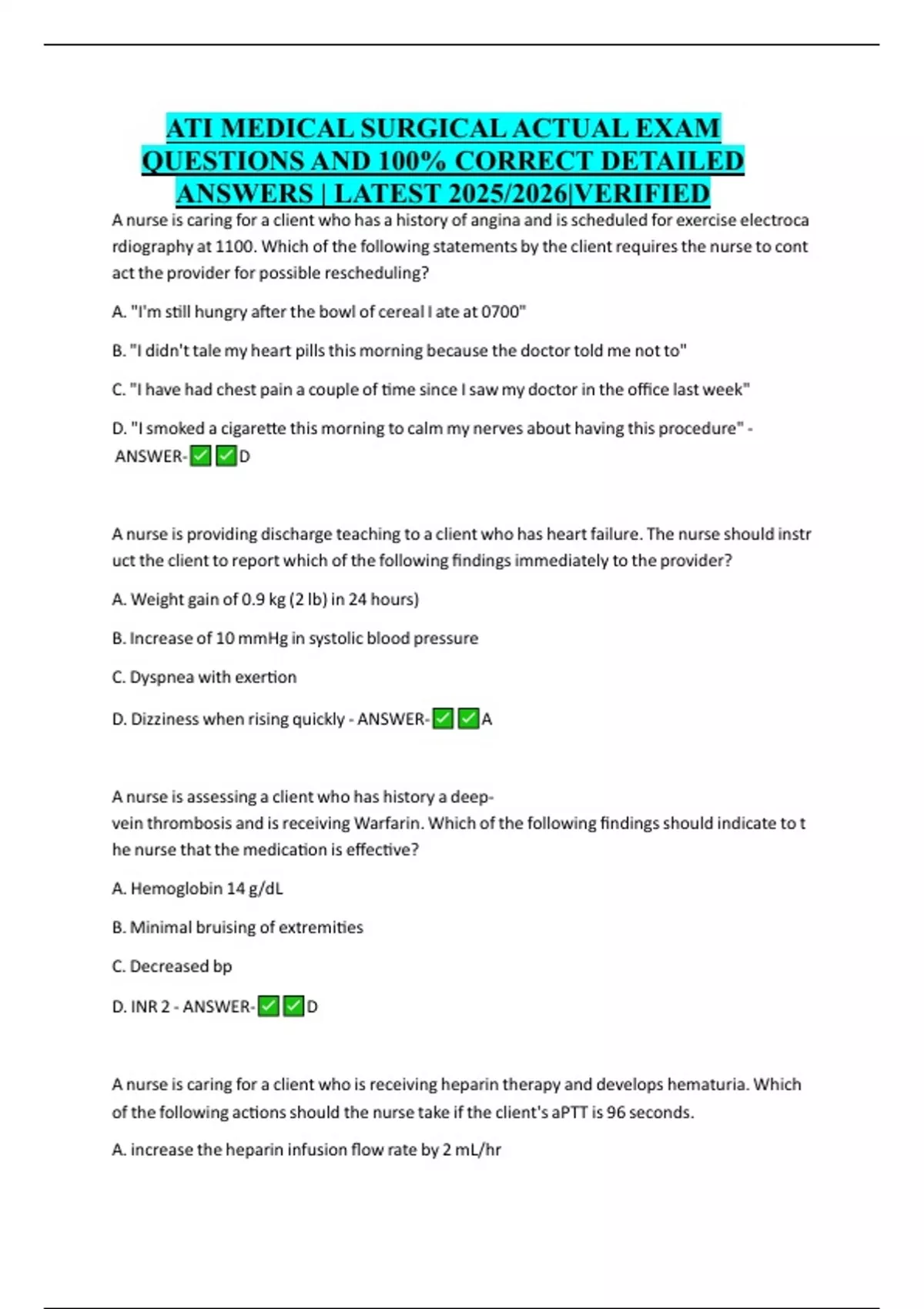 ATI MEDICAL SURGICAL ACTUAL EXAM QUESTIONS AND 100% CORRECT DETAILED ANSWERS | LATEST 2025/2026|VERIFIED