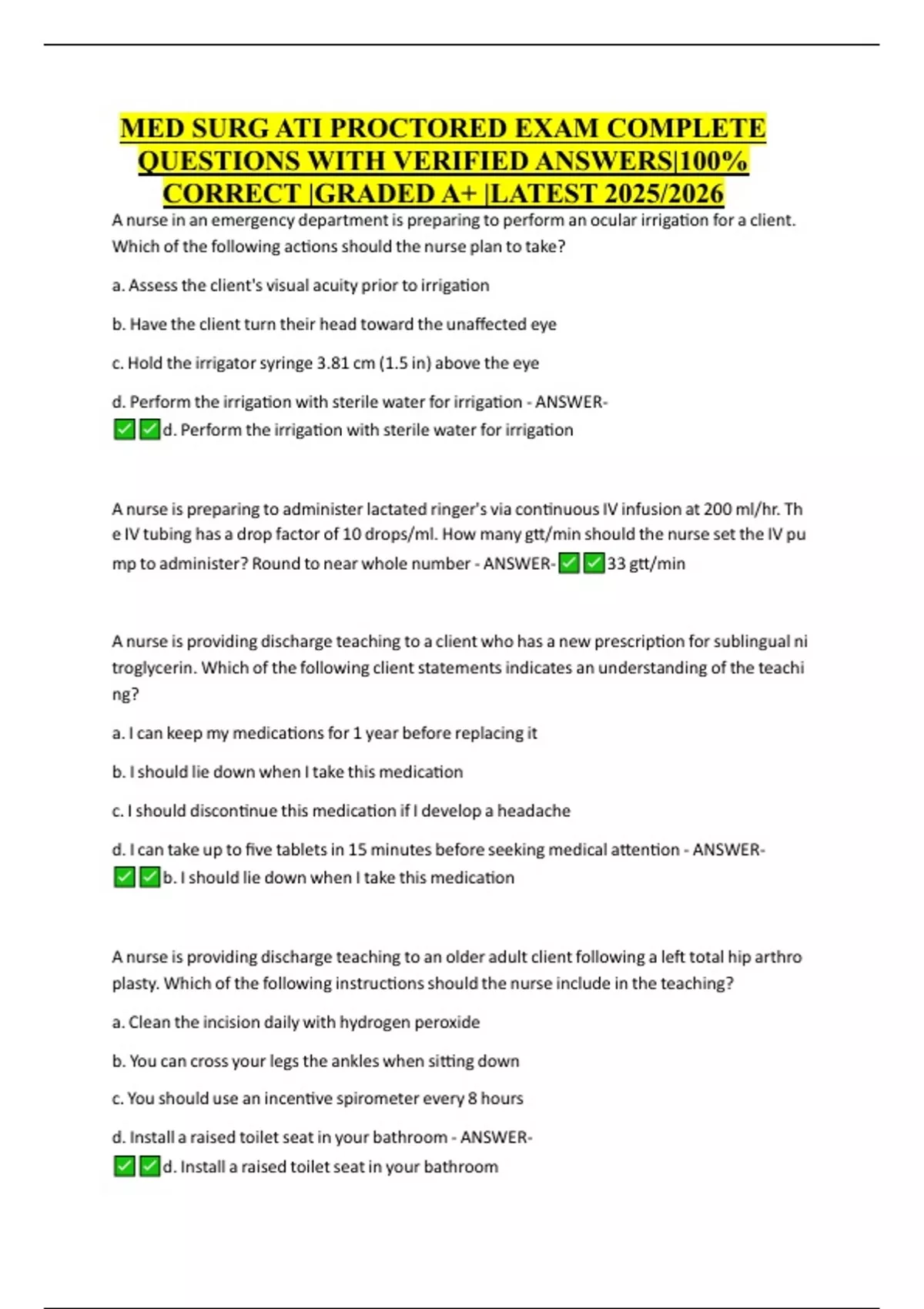 MED SURG ATI PROCTORED EXAM COMPLETE QUESTIONS WITH VERIFIED ANSWERS|100% CORRECT |GRADED A+ |LATEST 2025/2026