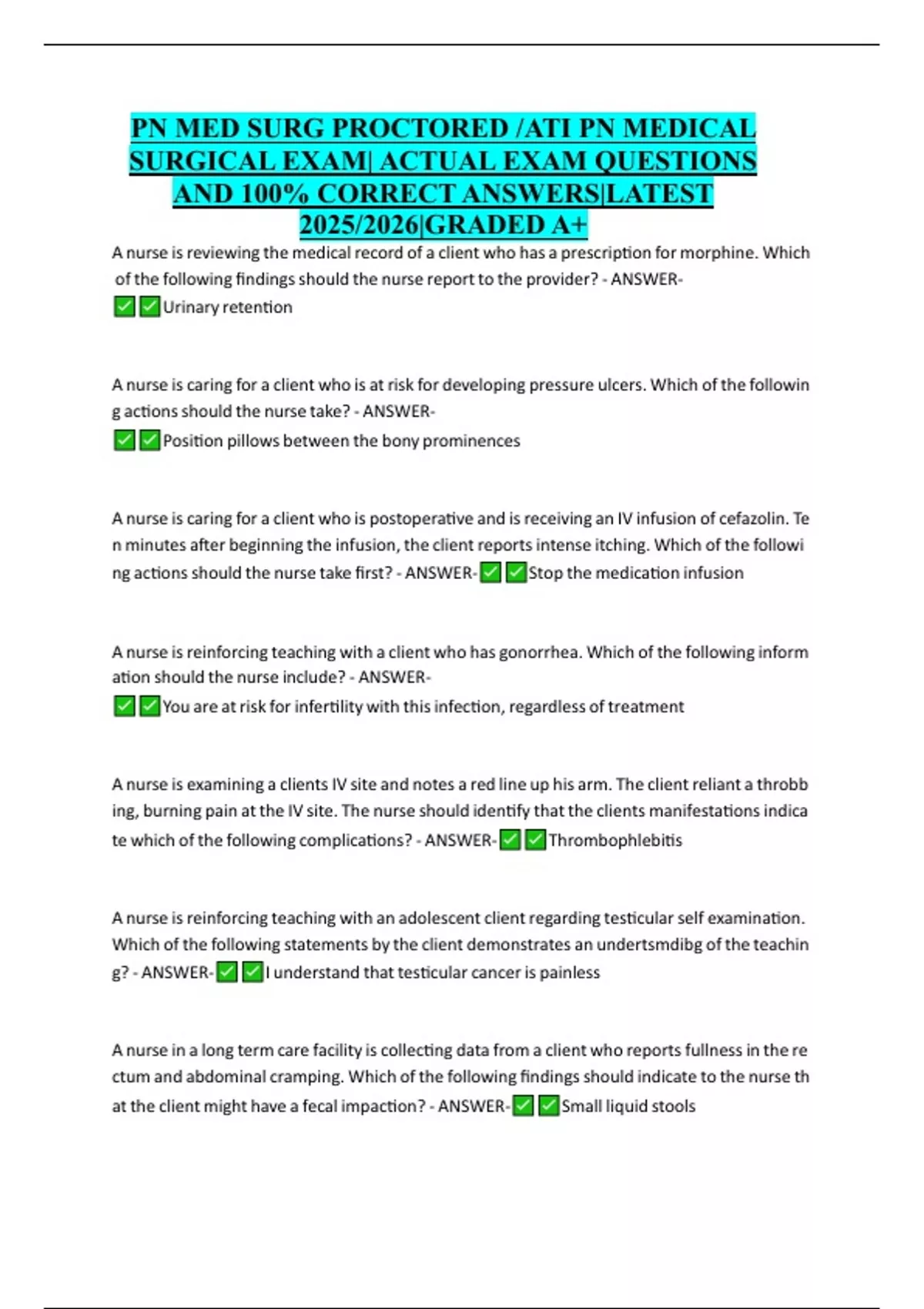 PN MED SURG PROCTORED /ATI PN MEDICAL SURGICAL EXAM| ACTUAL EXAM QUESTIONS AND 100% CORRECT ANSWERS|LATEST 2025/2026|GRADED A+