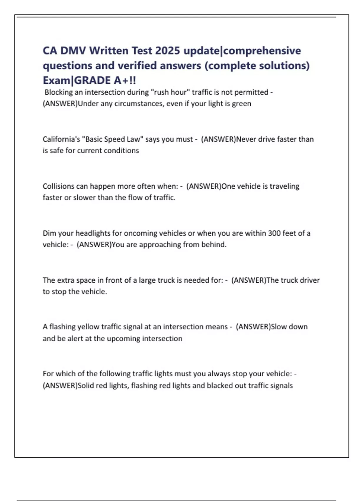 CA DMV Written Test 2025 update|comprehensive questions and verified answers (complete solutions) Exam|GRADE A+!!