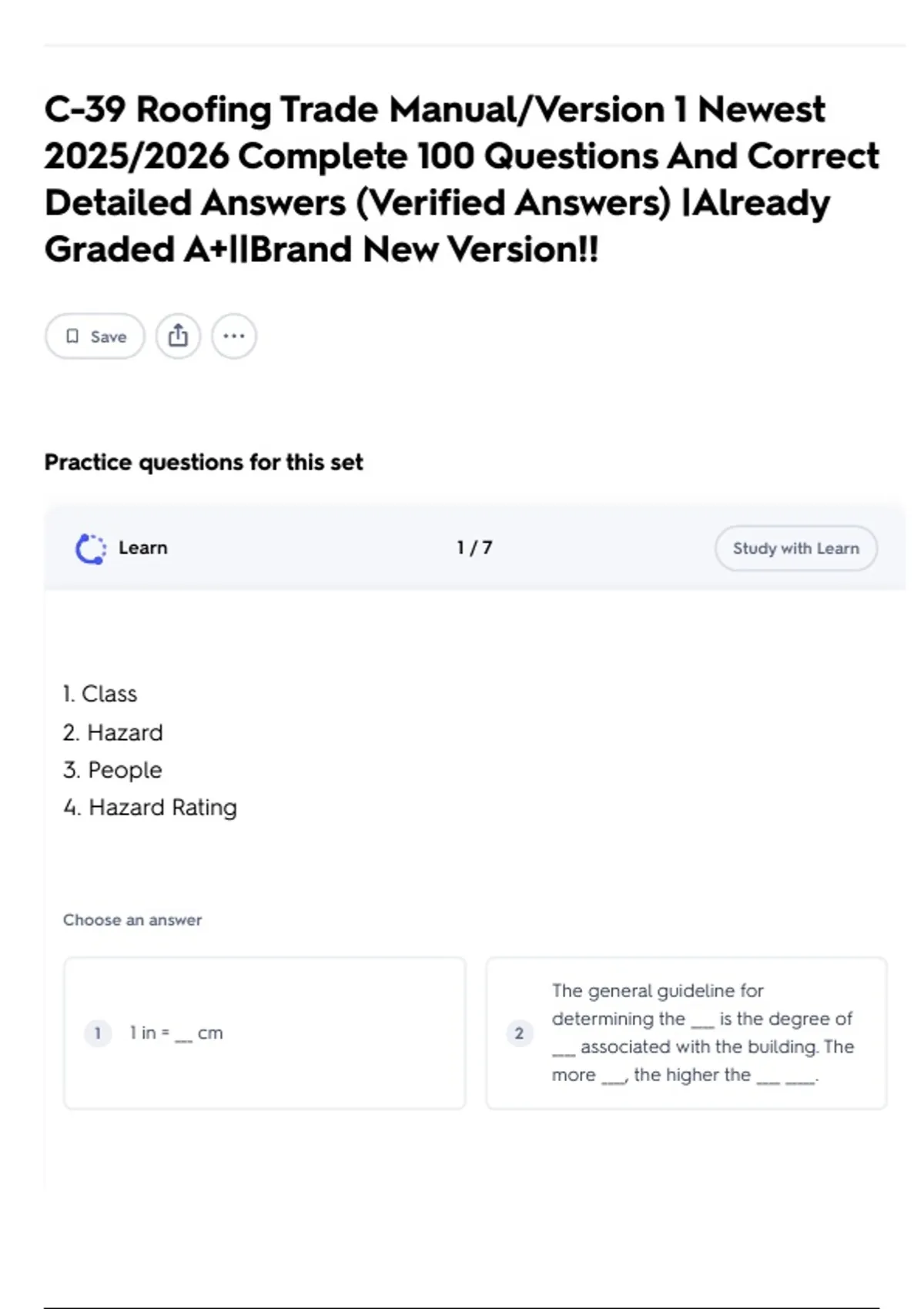 C-39 Roofing Trade Manual/Version 1 Newest 2025/2026 Complete 100 Questions And Correct Detailed Answers (Verified Answers) |Already Graded A+||Brand New Version!!