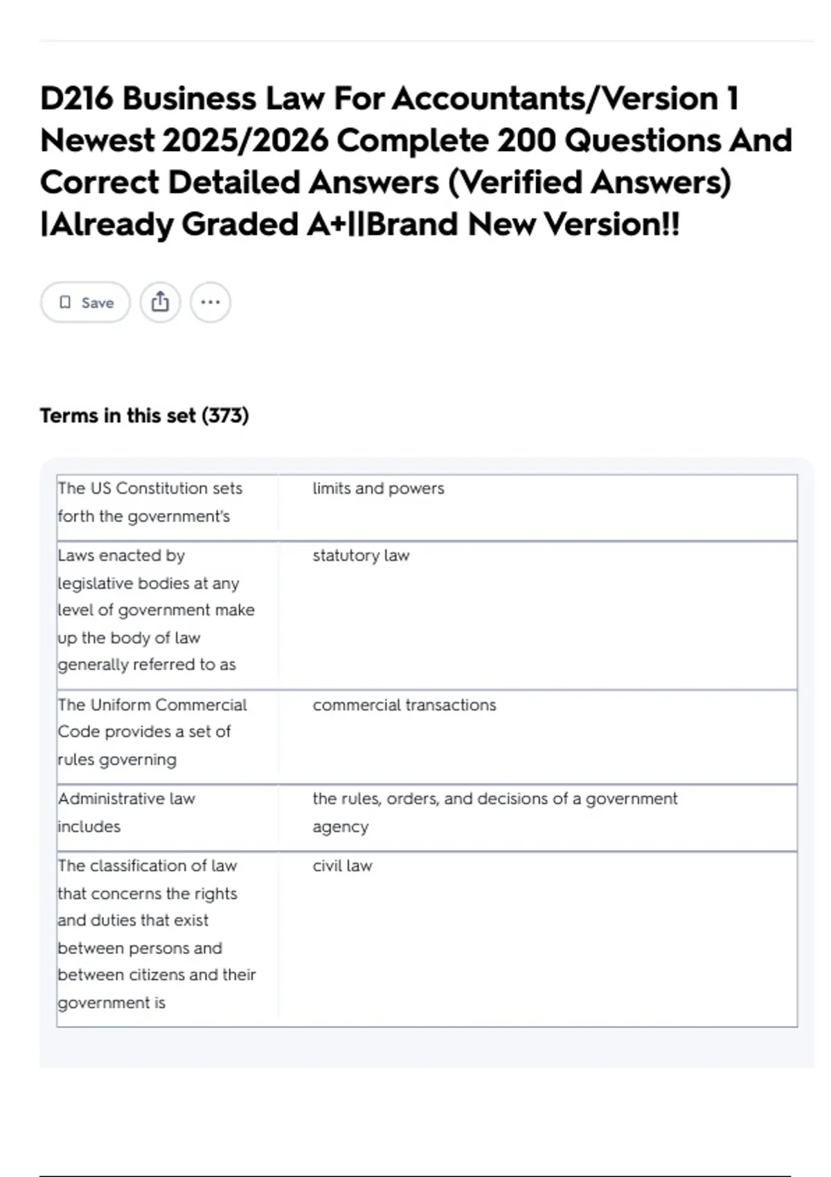 D216 Business Law For Accountants/Version 1 Newest 2025/2026 Complete 200 Questions And Correct Detailed Answers (Verified Answers) |Already Graded A+||Brand New Version!!