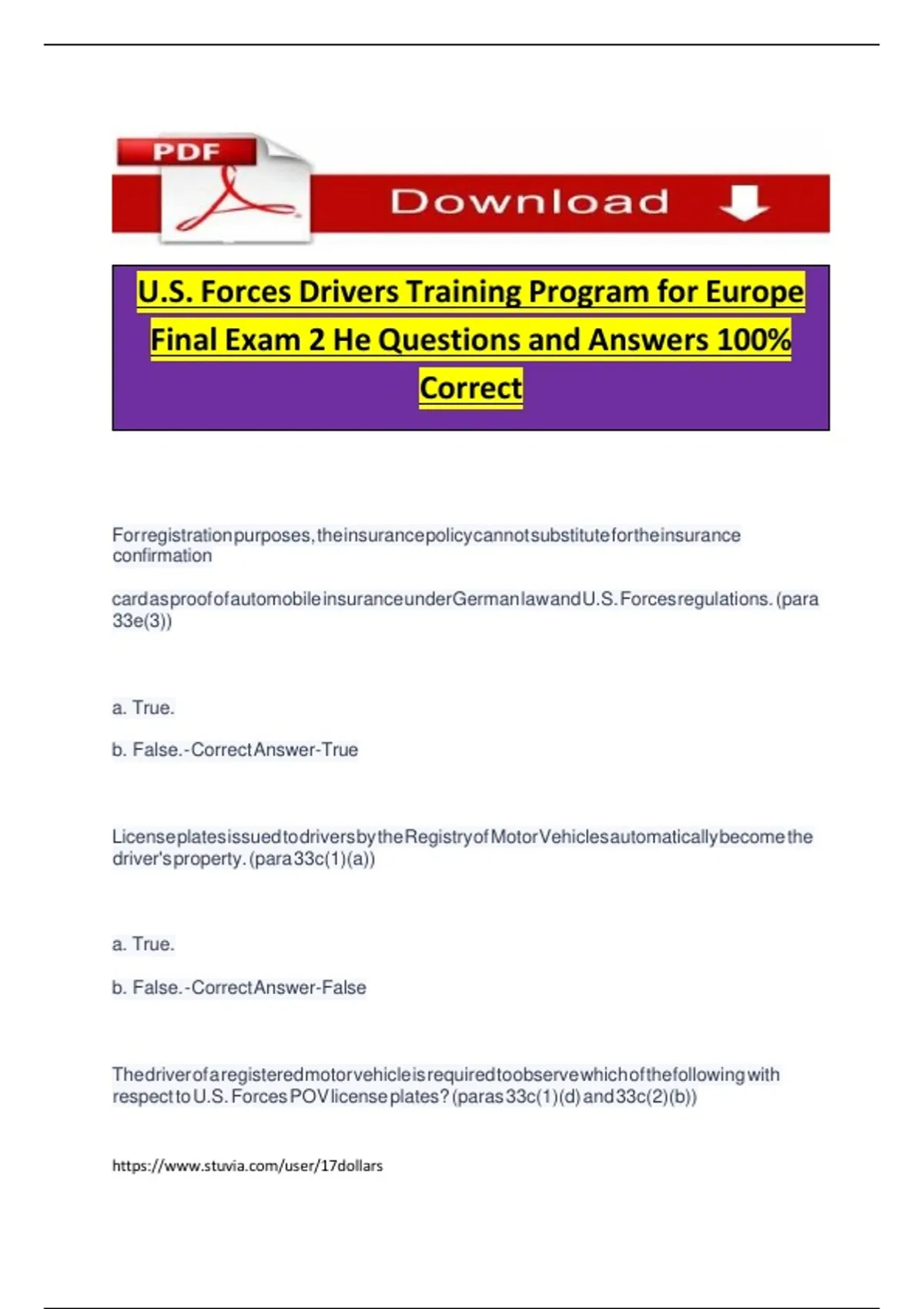 U.S. Forces Drivers Training Program for Europe Final Exam 2 He Questions and Answers 100% Correct U.S. Forces Drivers Training Program for Europe Final Exam 2 He Questions and Answers 100% Correct U.S. Forces Drivers Training Program for Europe Final Exam 2 He Questions and Answers 100% Correct