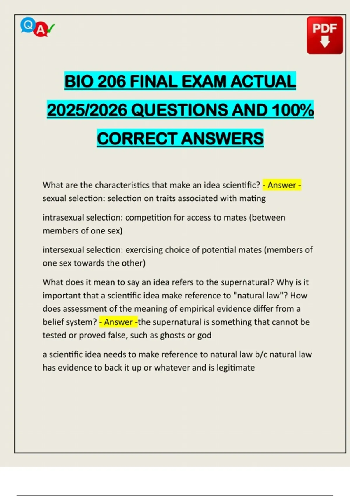 BIO 206 FINAL EXAM ACTUAL 2025/2026 QUESTIONS AND 100% CORRECT ANSWERS What are the characteristics that make an idea scientific? - Answer - sexual selection: selection on traits associated with mating intrasexual selection: competition for access to mates (between members of one sex) intersexual selection: exercising choice of potential mates (members of one sex towards the other) What does it mean to say an idea refers to the supernatural? Why is it important that a scientific idea make reference to "natural law"? How does assessment of the meaning of empirical evidence differ from a belief system? - Answer -the supernatural is something that cannot be tested or proved false, such as ghosts or god a scientific idea needs to make reference to natural law b/c natural law has evidence to back it up or whatever and is legitimateNeed assistance in Online classes, Exams & Assignments? Reach out for Full Course Assistance, Plagiarism-free Essay Writing, Research Paper & Discussion Posts. Confidential & Secure! Email now at: empirical evidence is measured; it is actually evidence a belief system is choosing to have faith in something with no particular reason to do so If we define "proof" as something being irrevocably true, has always been true, and will always be true, why is that inconsistent with our definition of science? - Answer -science needs to be falsifiable so if it is always irrevocably true it cannot be falsifiable If an idea is not falsifiable, why can it not be rejected as not true? - Answer -the word falsifiable means being able to made false, aka not true if you can't say something is false you
