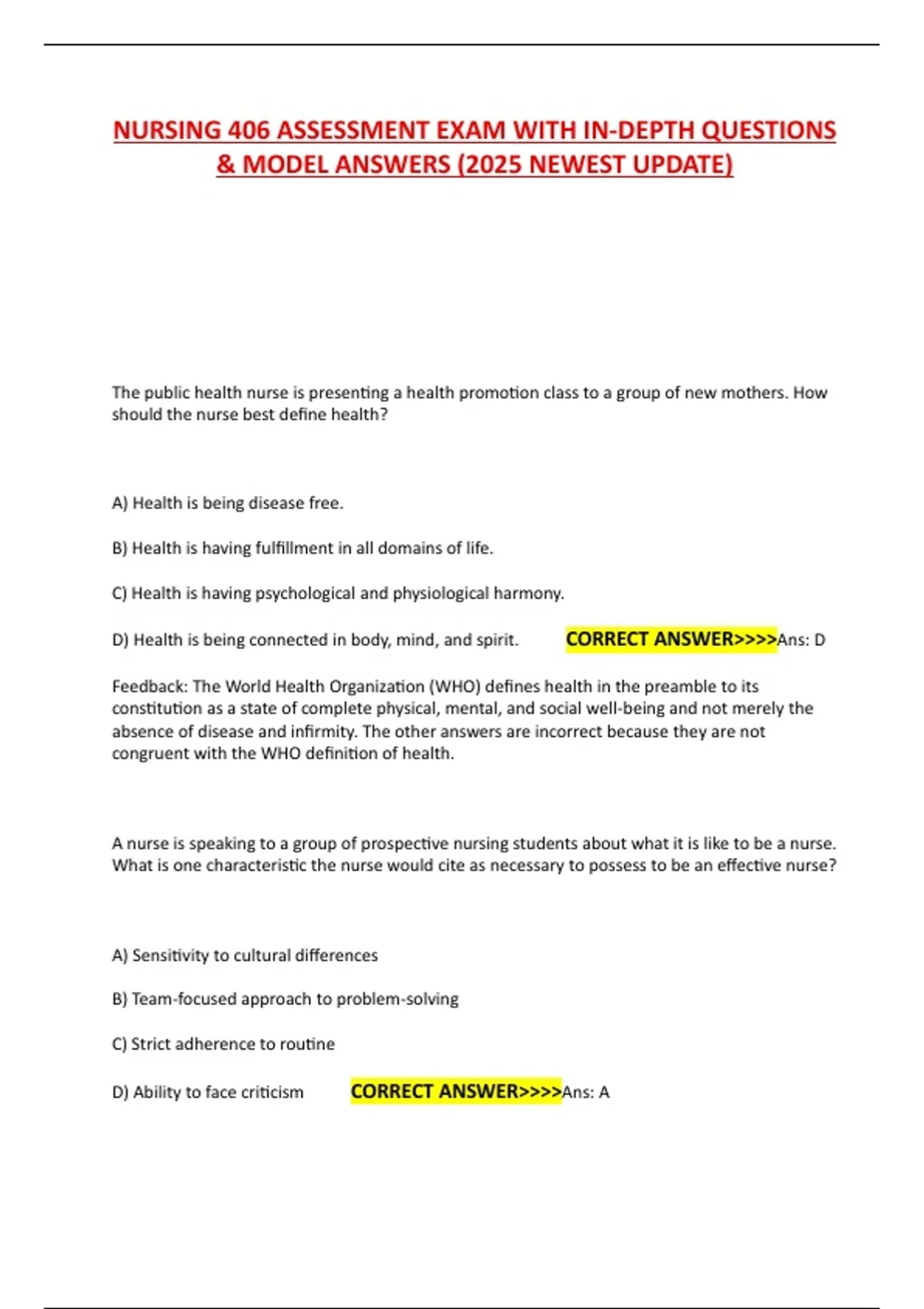 NURSING 406 ASSESSMENT EXAM WITH IN-DEPTH QUESTIONS