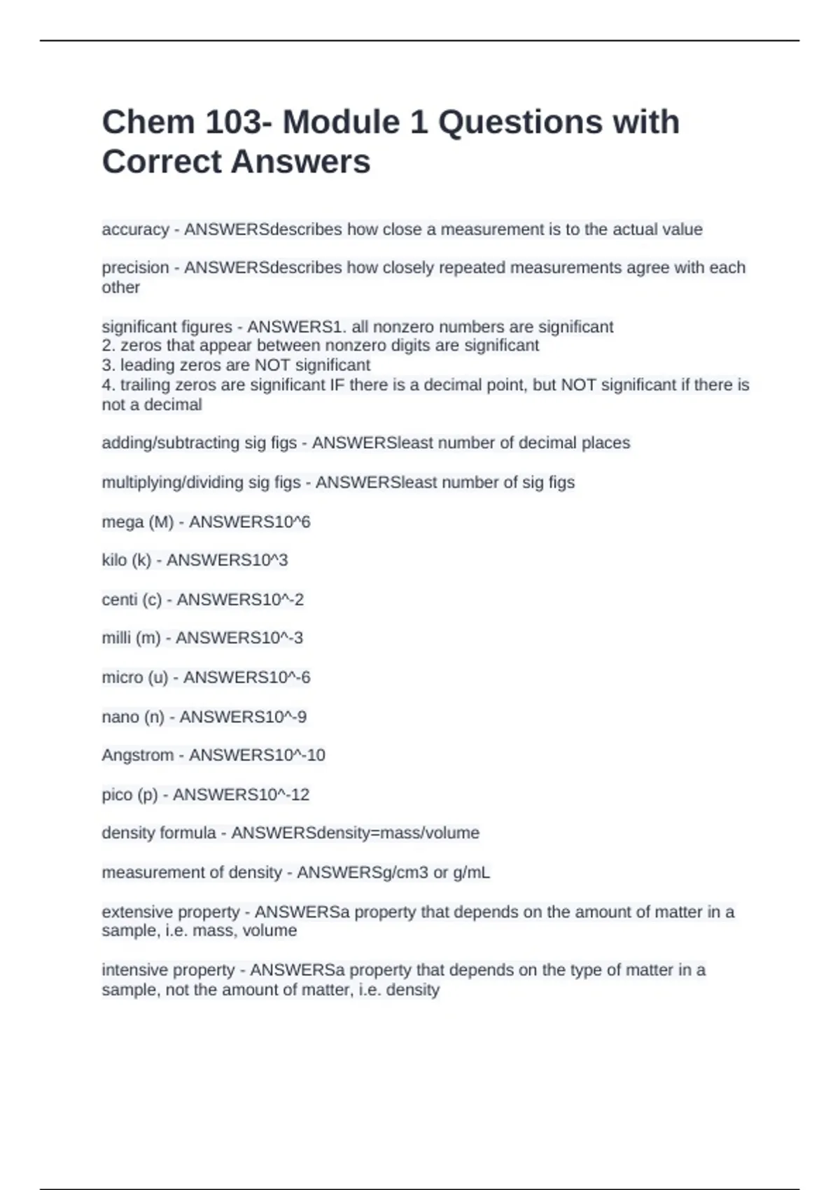 accuracy - ANSWERSdescribes how close a measurement is to the actual value precision - ANSWERSdescribes how closely repeated measurements agree with each other significant figures - ANSWERS1. all nonzero numbers are significant 2. zeros that appear between nonzero digits are significant 3. leading zeros are NOT significant 4. trailing zeros are significant IF there is a decimal point, but NOT significant if there is not a decimal adding/subtracting sig figs - ANSWERSleast number of decimal places multiplying/dividing sig figs - ANSWERSleast number of sig figs mega (M) - ANSWERS10^6 kilo (k) - ANSWERS10^3 centi (c) - ANSWERS10^-2 milli (m) - ANSWERS10^-3 micro (u) - ANSWERS10^-6 nano (n) - ANSWERS10^-9 Angstrom - ANSWERS10^-10 pico (p) - ANSWERS10^-12 density formula - ANSWERSdensity=mass/volume measurement of density - ANSWERSg/cm3 or g/mL extensive property - ANSWERSa property that depends on the amount of matter in a sample, i.e. mass, volume intensive property - ANSWERSa property that depends on the type of matter in a sample, not the amount of matter, i.e. density