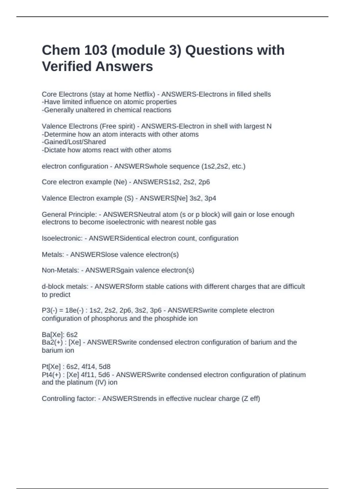 Core Electrons (stay at home Netflix) - ANSWERS-Electrons in filled shells -Have limited influence on atomic properties -Generally unaltered in chemical reactions Valence Electrons (Free spirit) - ANSWERS-Electron in shell with largest N -Determine how an atom interacts with other atoms -Gained/Lost/Shared -Dictate how atoms react with other atoms electron configuration - ANSWERSwhole sequence (1s2,2s2, etc.) Core electron example (Ne) - ANSWERS1s2, 2s2, 2p6 Valence Electron example (S) - ANSWERS[Ne] 3s2, 3p4 General Principle: - ANSWERSNeutral atom (s or p block) will gain or lose enough electrons to become isoelectronic with nearest noble gas Isoelectronic: - ANSWERSidentical electron count, configuration Metals: - ANSWERSlose valence electron(s) Non-Metals: - ANSWERSgain valence electron(s) d-block metals: - ANSWERSform stable cations with different charges that are difficult to predict P3(-) = 18e(-) : 1s2, 2s2, 2p6, 3s2, 3p6 - ANSWERSwrite complete electron configuration of phosphorus and the phosphide ion Ba[Xe]: 6s2 Ba2(+) : [Xe] - ANSWERSwrite condensed electron configuration of barium and the barium ion Pt[Xe] : 6s2, 4f14, 5d8 Pt4(+) : [Xe] 4f11, 5d6 - ANSWERSwrite condensed electron configuration of platinum and the platinum (IV) ion Controlling factor: - ANSWERStrends in effective nuclear charge (Z eff)