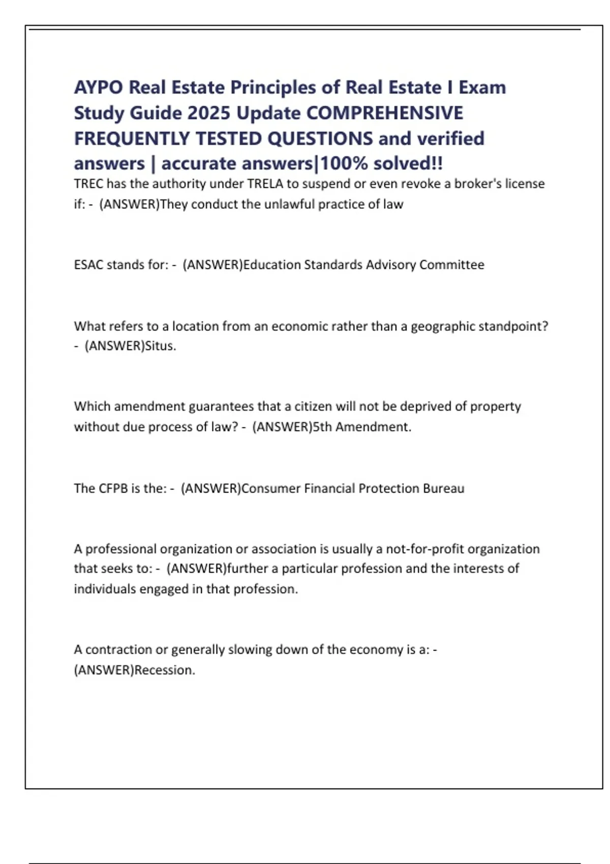 AYPO Real Estate Principles of Real Estate I Exam