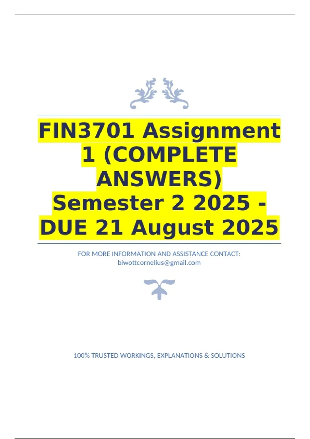 FIN3701 Assignment 1 (COMPLETE ANSWERS) Semester 2 2025 - DUE 21 August 2025
