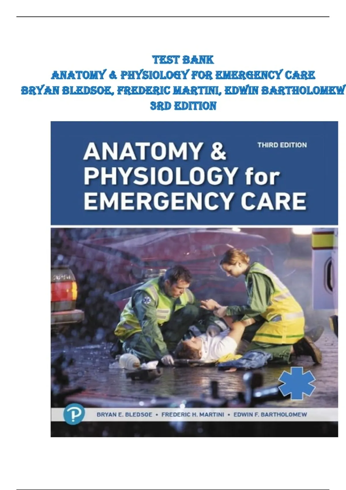 Download the Anatomy & Physiology for Emergency Care, 3rd Edition (Bledsoe, 2020) Test Bank with 100% verified questions and answers. Covers all chapters including cell biology, tissues, skeletal, muscular, cardiovascular, respiratory, digestive, and nervous systems. Perfect for exam prep and emergency care students.