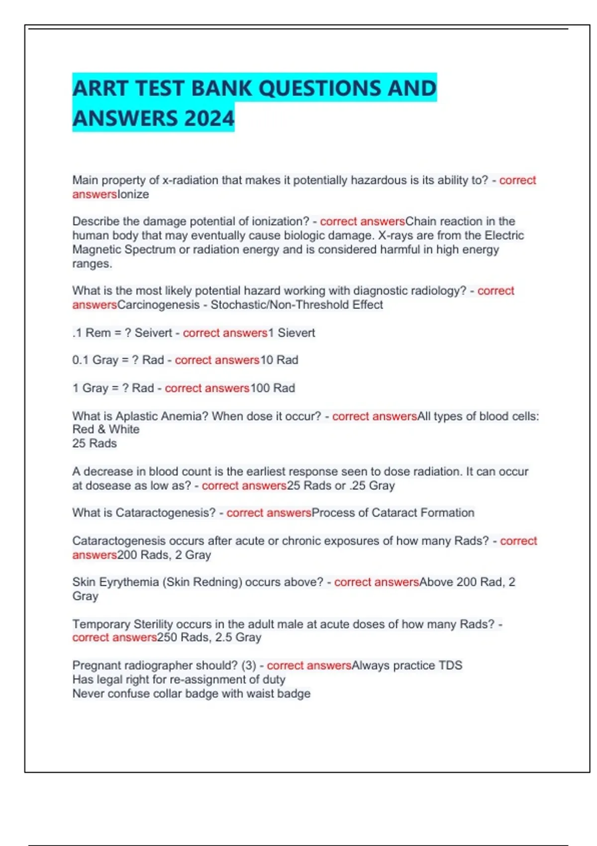ARRT TEST BANK QUESTIONS AND ANSWERS 2024