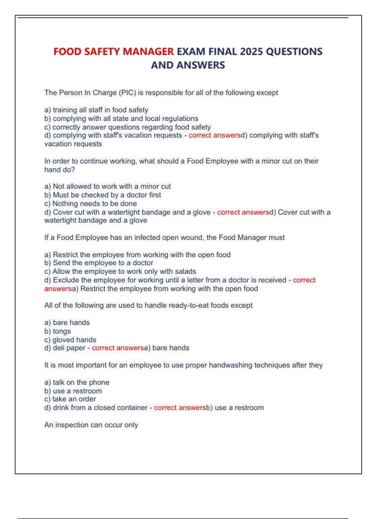 FOOD SAFETY MANAGER EXAM FINAL 2025 QUESTIONS AND ANSWERS
