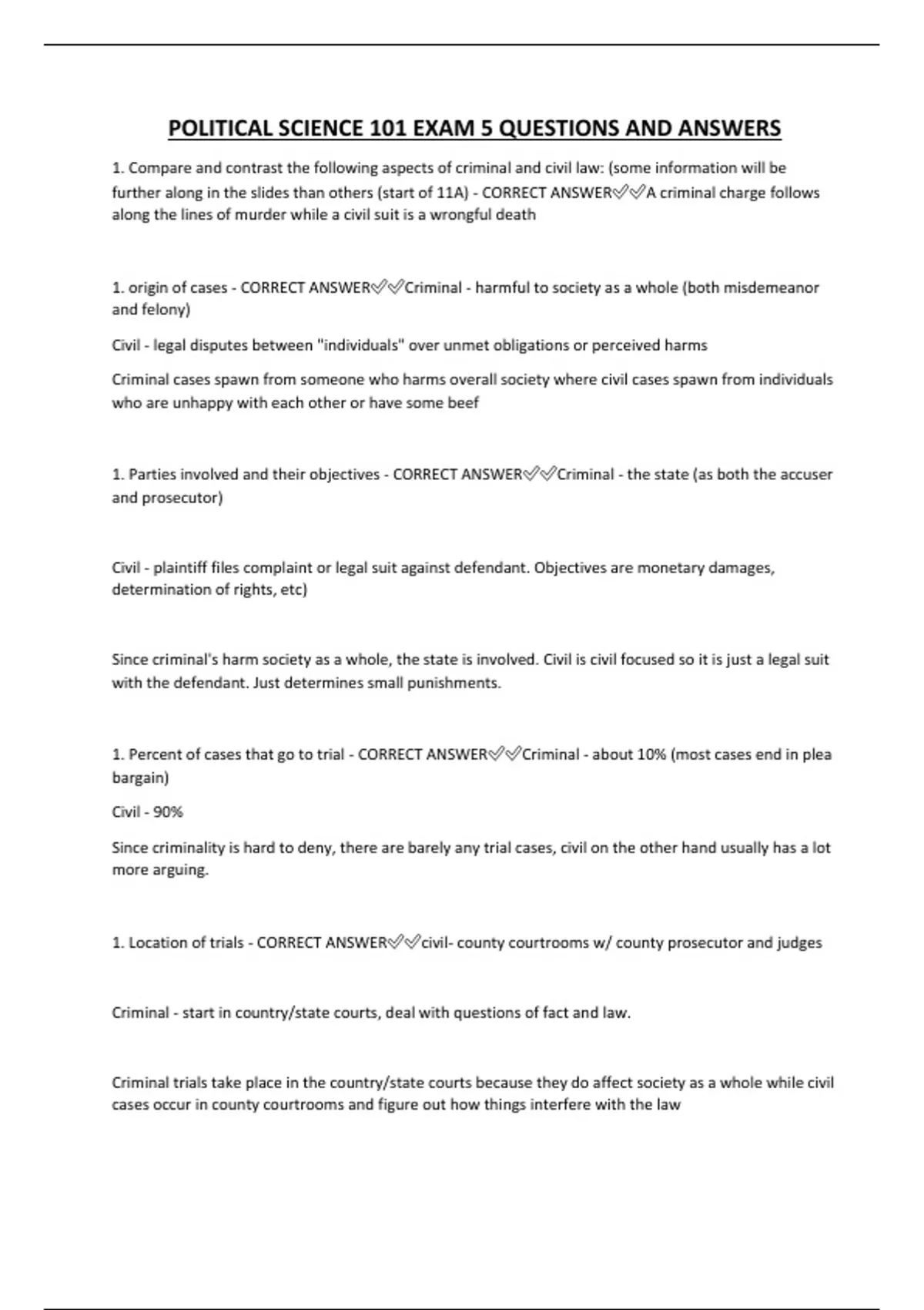 POLITICAL SCIENCE 101 EXAM 5 QUESTIONS AND ANSWERS 1. Compare and contrast the following aspects of criminal and civil law: (some information will be further along in the slides than others (start of 11A) - CORRECT ANSWERA criminal charge follows along the lines of murder while a civil suit is a wrongful death