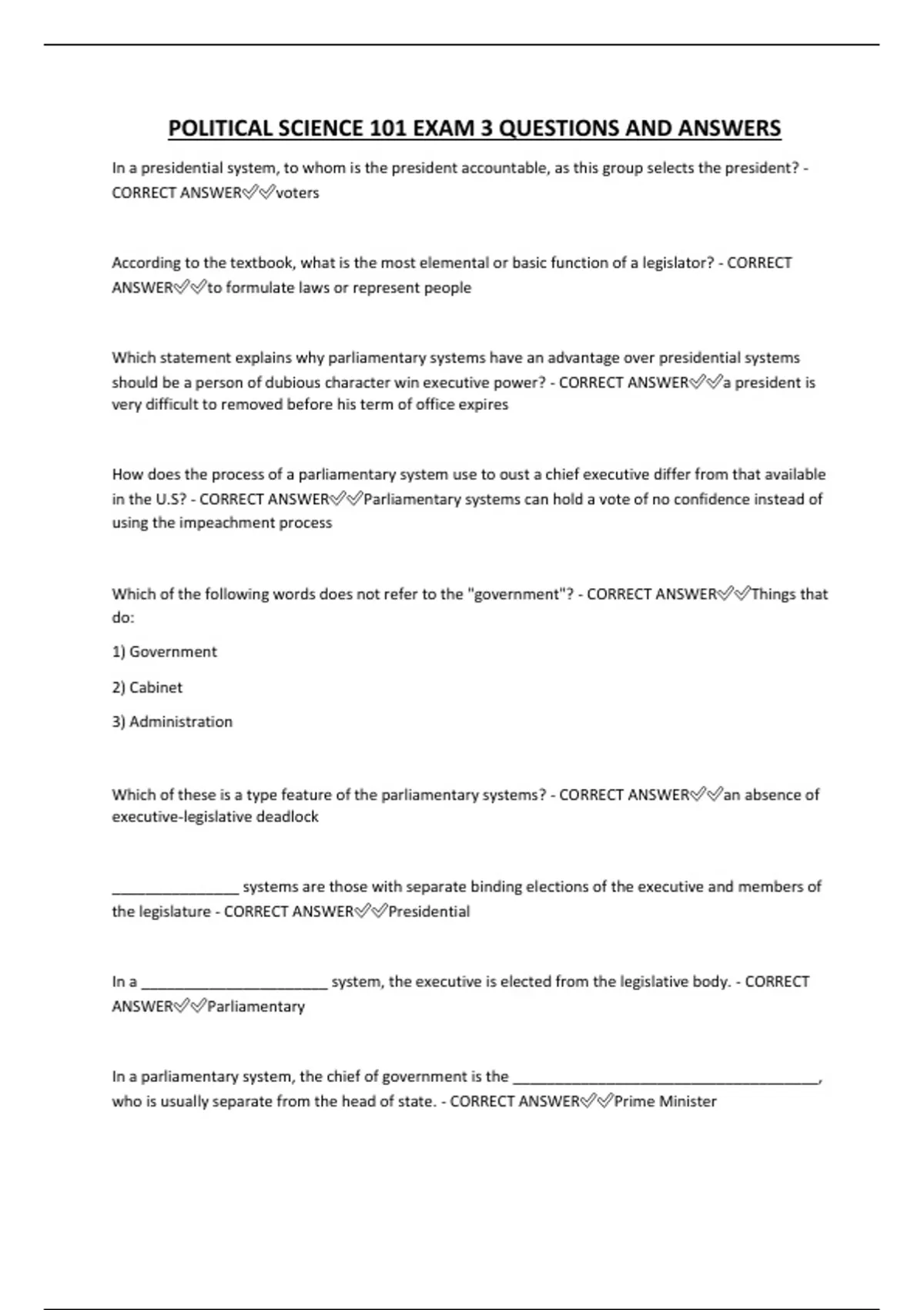 POLITICAL SCIENCE 101 EXAM 3 QUESTIONS AND ANSWERS In a presidential system, to whom is the president accountable, as this group selects the president? - CORRECT ANSWERvoters