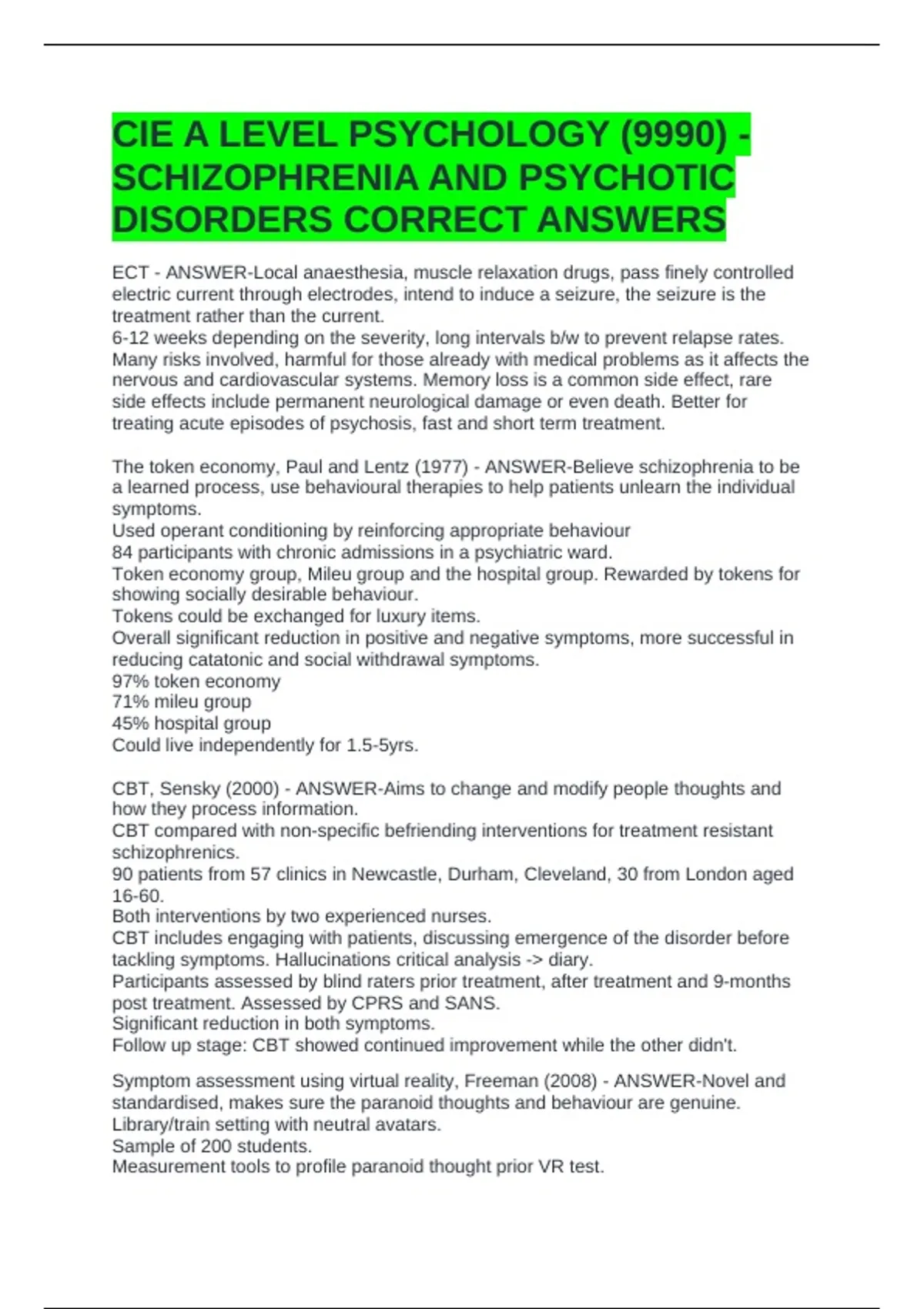 The token economy, Paul and Lentz (1977) - ANSWER-Believe schizophrenia to be