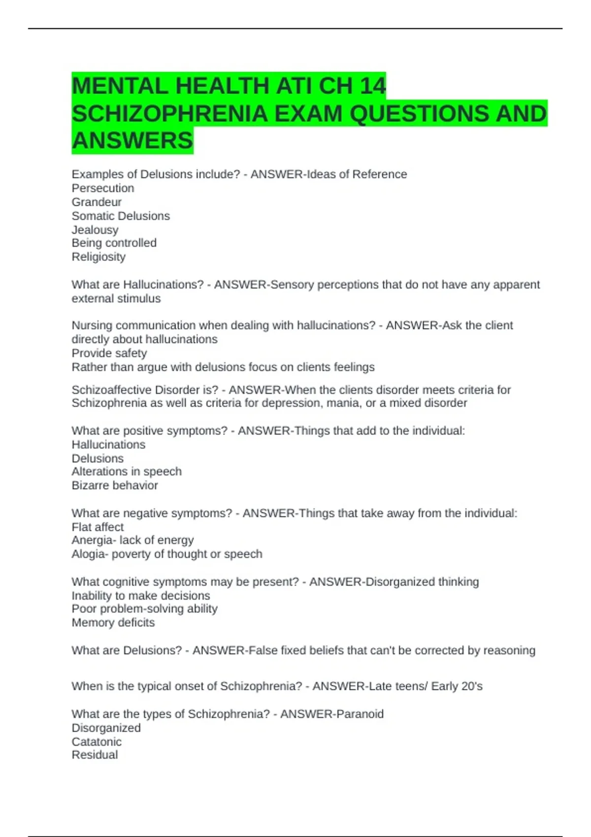 SCHIZOPHRENIA EXAM QUESTIONS AND