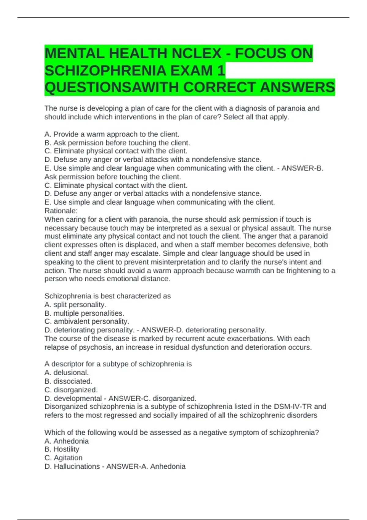MENTAL HEALTH NCLEX - FOCUS ON