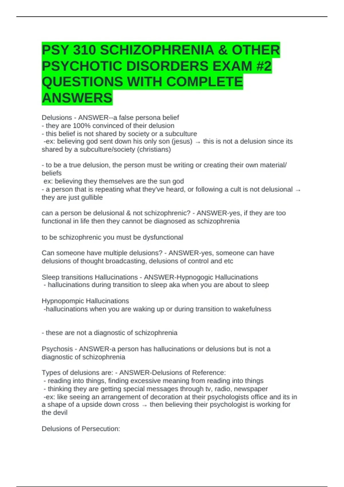 PSY 310 SCHIZOPHRENIA & OTHER PSYCHOTIC DISORDERS EXAM #2 QUESTIONS WITH COMPLETE ANSWERS