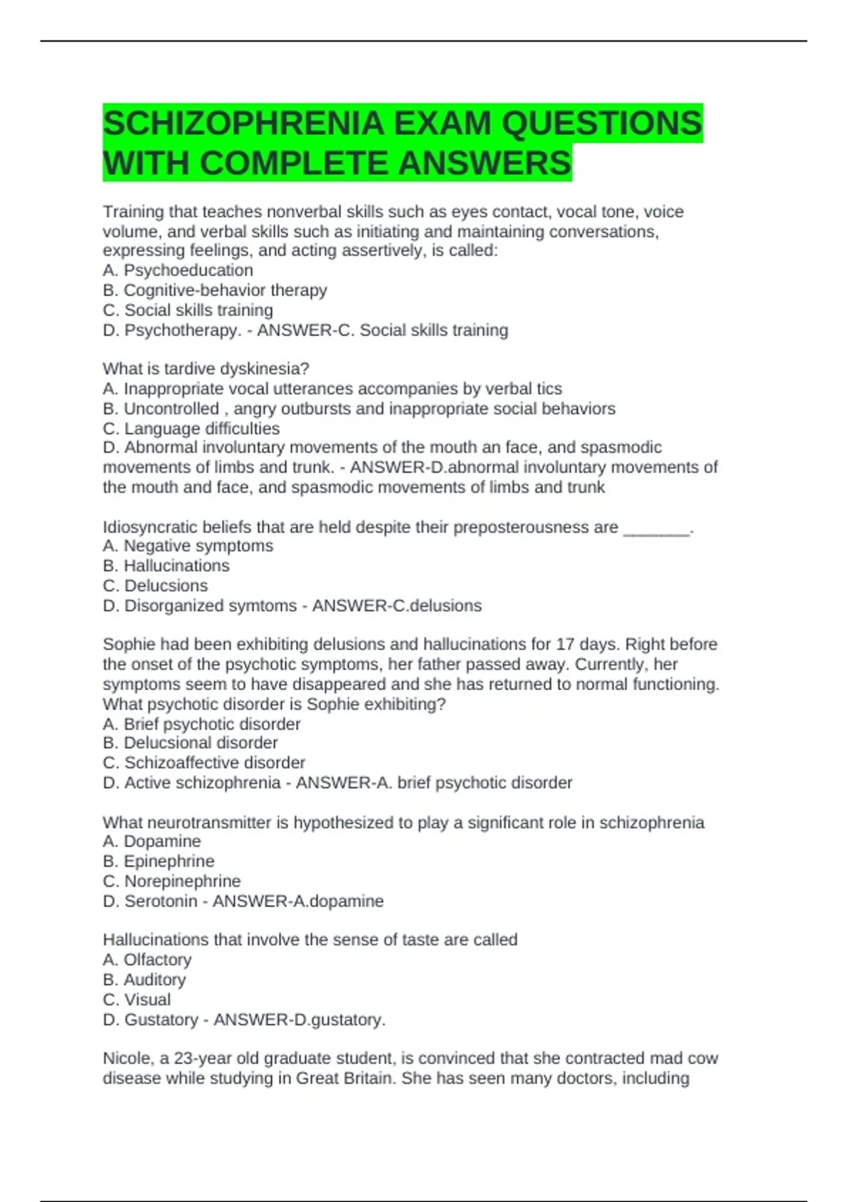 SCHIZOPHRENIA EXAM QUESTIONS WITH COMPLETE ANSWERS