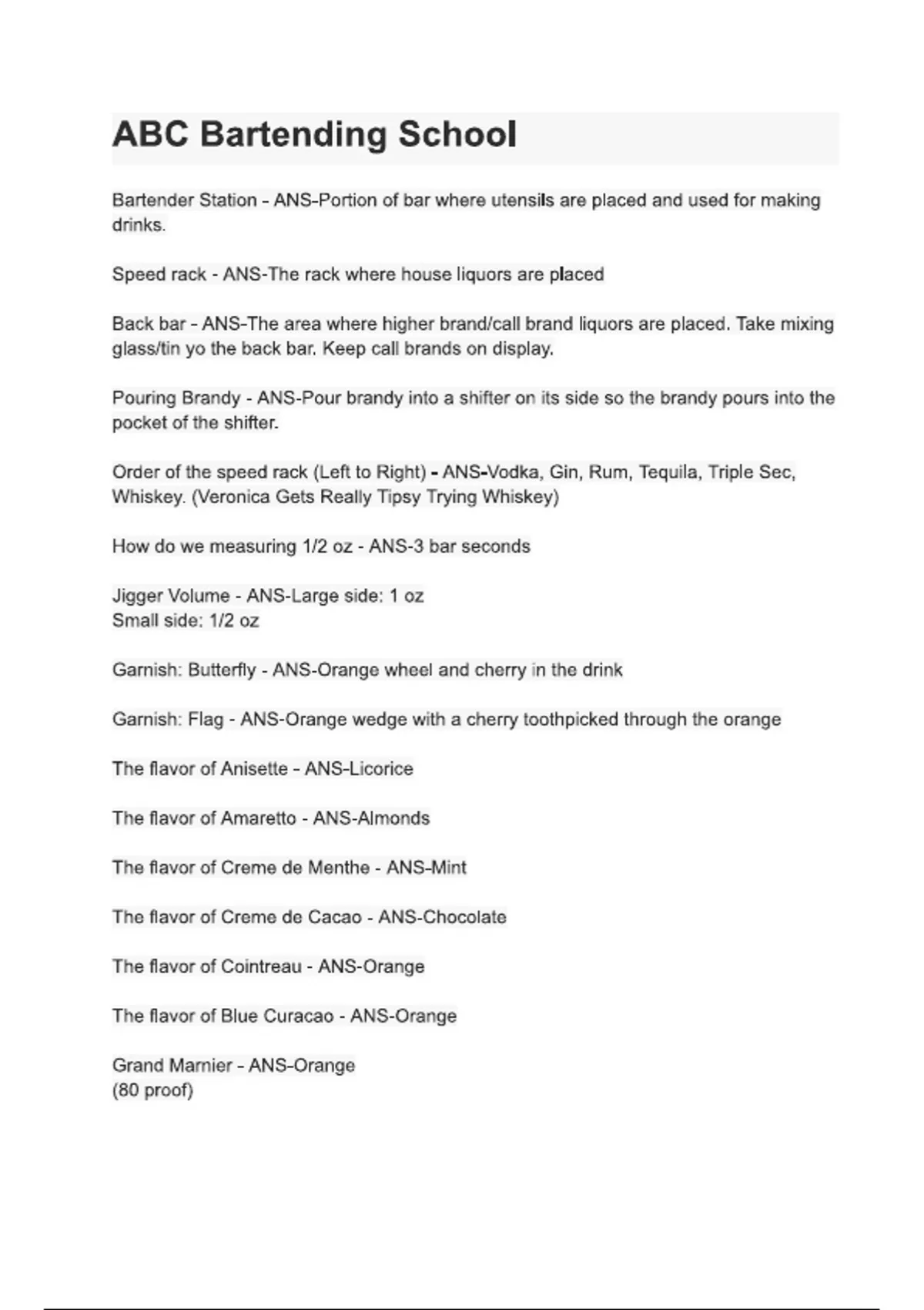 ABC Bartending School questions and answers