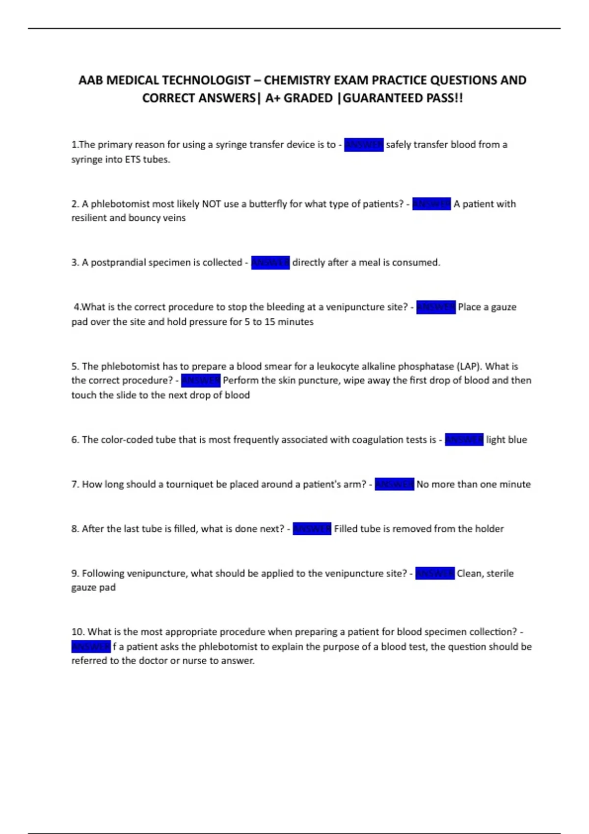 AAB MEDICAL TECHNOLOGIST – CHEMISTRY EXAM PRACTICE QUESTIONS AND CORRECT ANSWERS| A+ GRADED |GUARANTEED PASS!!