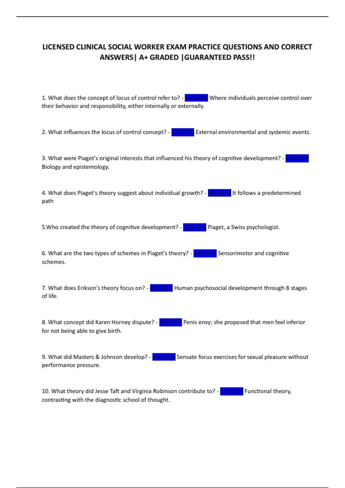 LICENSED CLINICAL SOCIAL WORKER EXAM PRACTICE QUESTIONS AND CORRECT