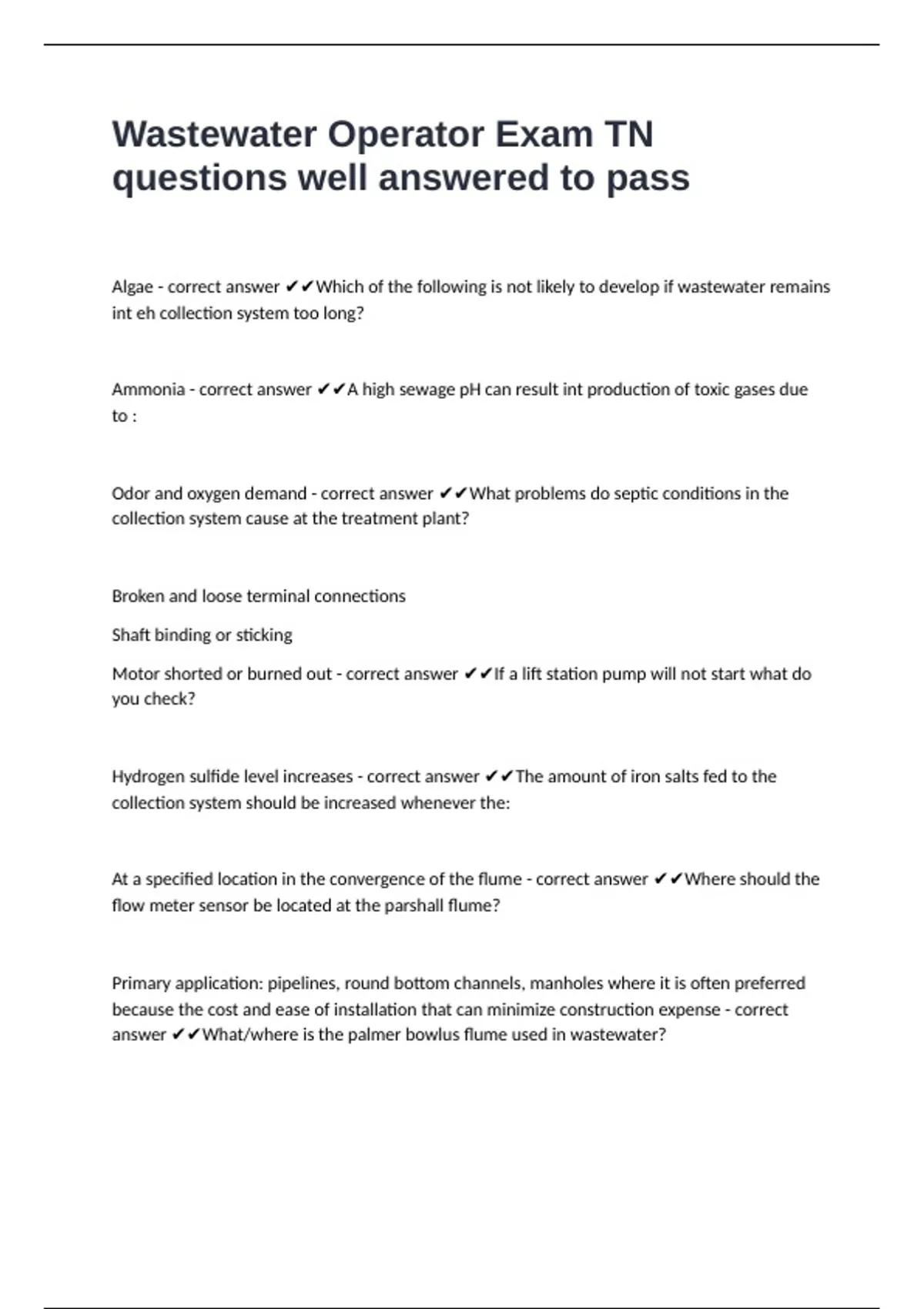 Wastewater Operator Exam TN questions well answered to passAlgae - correct answer Which of the following is not likely to develop if wastewater remains int eh collection system too long? Ammonia - correct answer A high sewage pH can result int production of toxic gases due to : Odor and oxygen demand - correct answer What problems do septic conditions in the collection system cause at the treatment plant? Broken and loose terminal connections Shaft binding or sticking Motor shorted or burned out - correct answer If a lift station pump will not start what do you check? Hydrogen sulfide level increases - correct answer The amount of iron salts fed to the collection system should be increased whenever the: At a specified location in the convergence of the flume - correct answer Where should the flow meter sensor be located at the parshall flume?