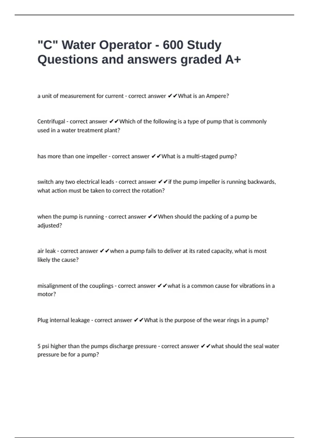 C Water Operator - 600 Study Questions and answers graded A+a unit of measurement for current - correct answer What is an Ampere? Centrifugal - correct answer Which of the following is a type of pump that is commonly used in a water treatment plant? has more than one impeller - correct answer What is a multi-staged pump? switch any two electrical leads - correct answer if the pump impeller is running backwards, what action must be taken to correct the rotation? when the pump is running - correct answer When should the packing of a pump be adjusted? air leak - correct answer when a pump fails to deliver at its rated capacity, what is most likely the cause? misalignment of the couplings - correct answer what is a common cause for vibrations in a motor? Plug internal leakage - correct answer What is the purpose of the wear rings in a pump? 5 psi higher than the pumps discharge pressure - correct answer what should the seal water pressure be for a pump?