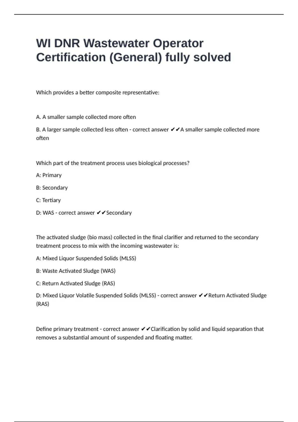WI DNR Wastewater Operator Certification (General) fully solved Which provides a better composite representative: A. A smaller sample collected more often B. A larger sample collected less often - correct answer A smaller sample collected more often Which part of the treatment process uses biological processes? A: Primary B: Secondary C: Tertiary D: WAS - correct answer Secondary The activated sludge (bio mass) collected in the final clarifier and returned to the secondary treatment process to mix with the incoming wastewater is: A: Mixed Liquor Suspended Solids (MLSS) B: Waste Activated Sludge (WAS) C: Return Activated Sludge (RAS) D: Mixed Liquor Volatile Suspended Solids (MLSS) - correct answer Return Activated Sludge (RAS) Define primary treatment - correct answer Clarification by solid and liquid separation that removes a substantial amount of suspended and floating matter.