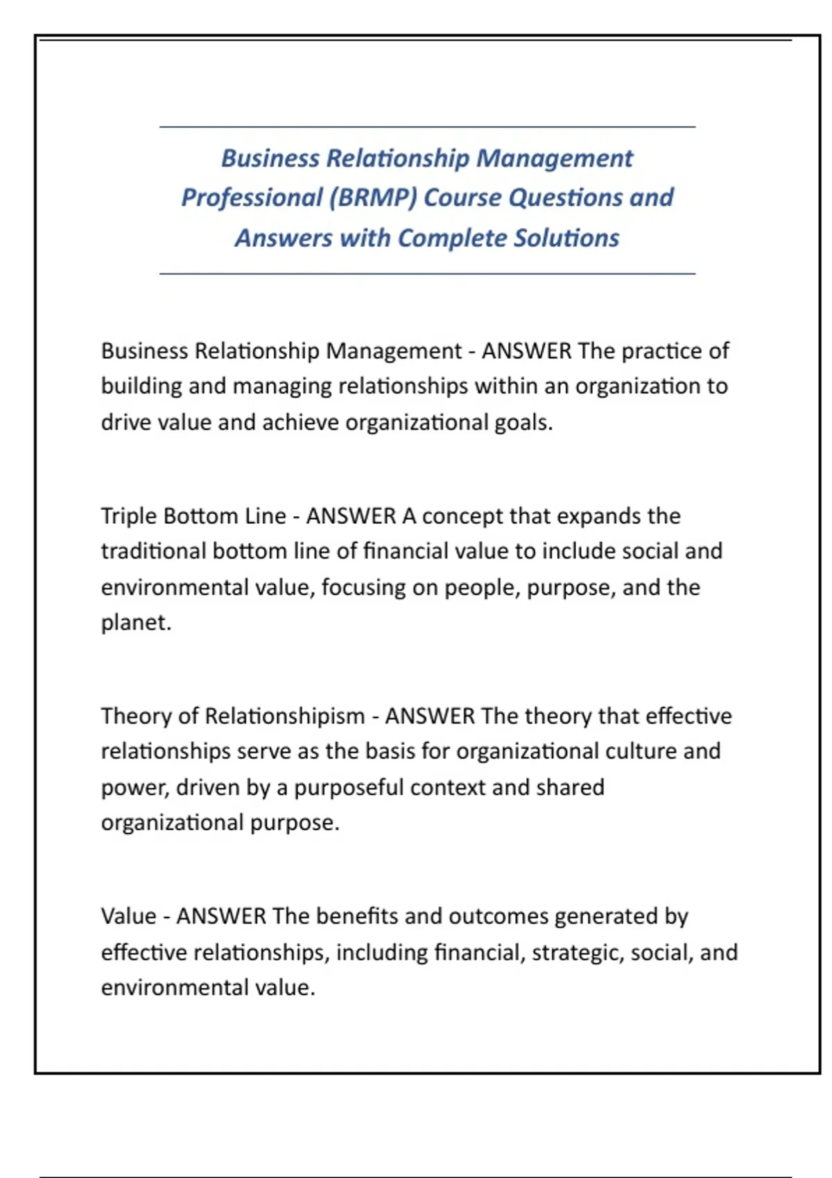 Business Relationship Management Professional (BRMP) Course Questions and Answers with Complete Solutions