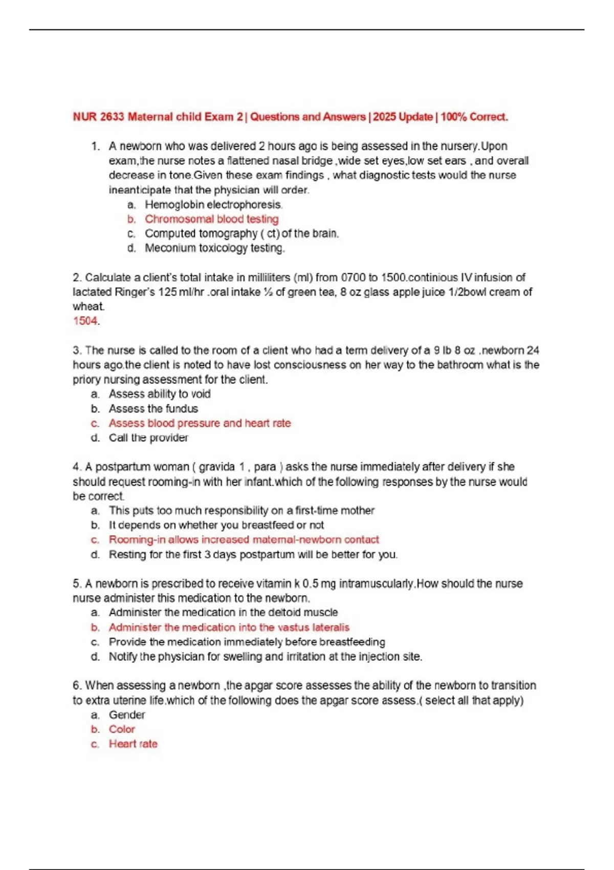 NUR 2633 Maternal child Exam 2 | Questions and Answers | 2025 Update | 100% Correct.