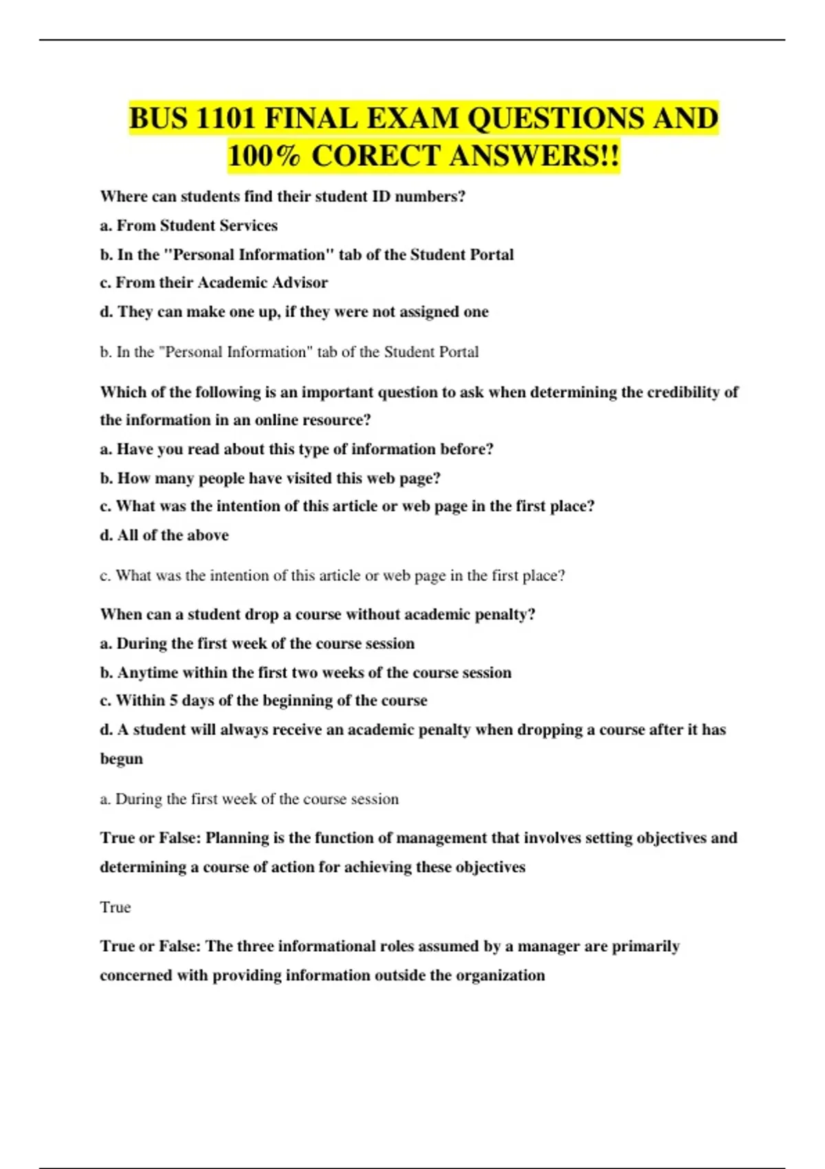 BUS 1101 FINAL EXAM QUESTIONS AND 100% CORECT ANSWERS!!