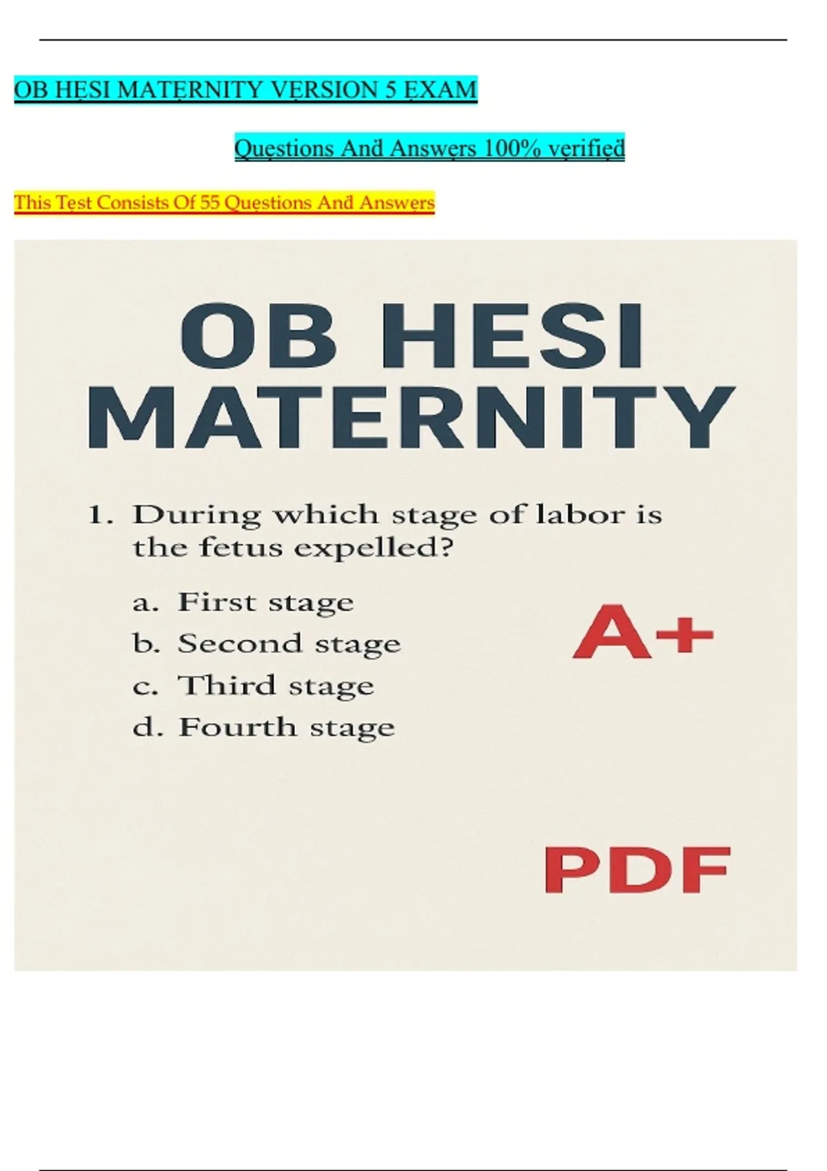 Get ready to ace your Maternity and OB exam with confidence! This comprehensive study resource provides you with a vast collection of HESI Maternity and OB Version 5 exam questions, complete with verified and rationalized answers. This valuable tool is designed to help you assess your knowledge, identify areas for improvement, and develop a deeper understanding of key concepts and principles in maternity and obstetrics. With this exam question bank, you'll be able to test your skills, track your progress, and feel more prepared for your certification exam. Make the most of your study time and achieve your goals with this trusted and reliable study aid." Let me know if you need any adjustments or have further requests!