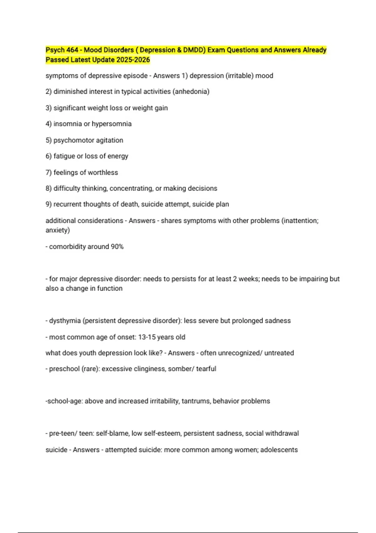 Psych 464 - Mood Disorders ( Depression & DMDD) Exam Questions and Answers Already Passed Latest Update symptoms of depressive episode - Answers 1) depression (irritable) mood 2) diminished interest in typical activities (anhedonia) 3) significant weight loss or weight gain 4) insomnia or hypersomnia 5) psychomotor agitation 6) fatigue or loss of energy 7) feelings of worthless 8) difficulty thinking, concentrating, or making decisions 9) recurrent thoughts of death, suicide attempt, suicide plan additional considerations - Answers - shares symptoms with other problems (inattention; anxiety) - comorbidity around 90% - for major depressive disorder: needs to persists for at least 2 weeks; needs to be impairing but also a change in function - dysthymia (persistent depressive disorder): less severe but prolonged sadness - most common age of onset: 13-15 years old what does youth depression look like? - Answers - often unrecognized/ untreated - preschool (rare): excessive clinginess, somber/ tearful -school-age: above and increased irritability, tantrums, behavior problems - pre-teen/ teen: self-blame, low self-esteem, persistent sadness, social withdrawal suicide - Answers - attempted suicide: more common among women; adolescents - completed suicide: more common in males; adults suicide risk factors - Answers - lack of future orientation/ hopelessness - plan and access to the plan - low regard for personal safety - thwarted belongingness - perceived burdernsomeness - changes in social habits - preoccupation with death