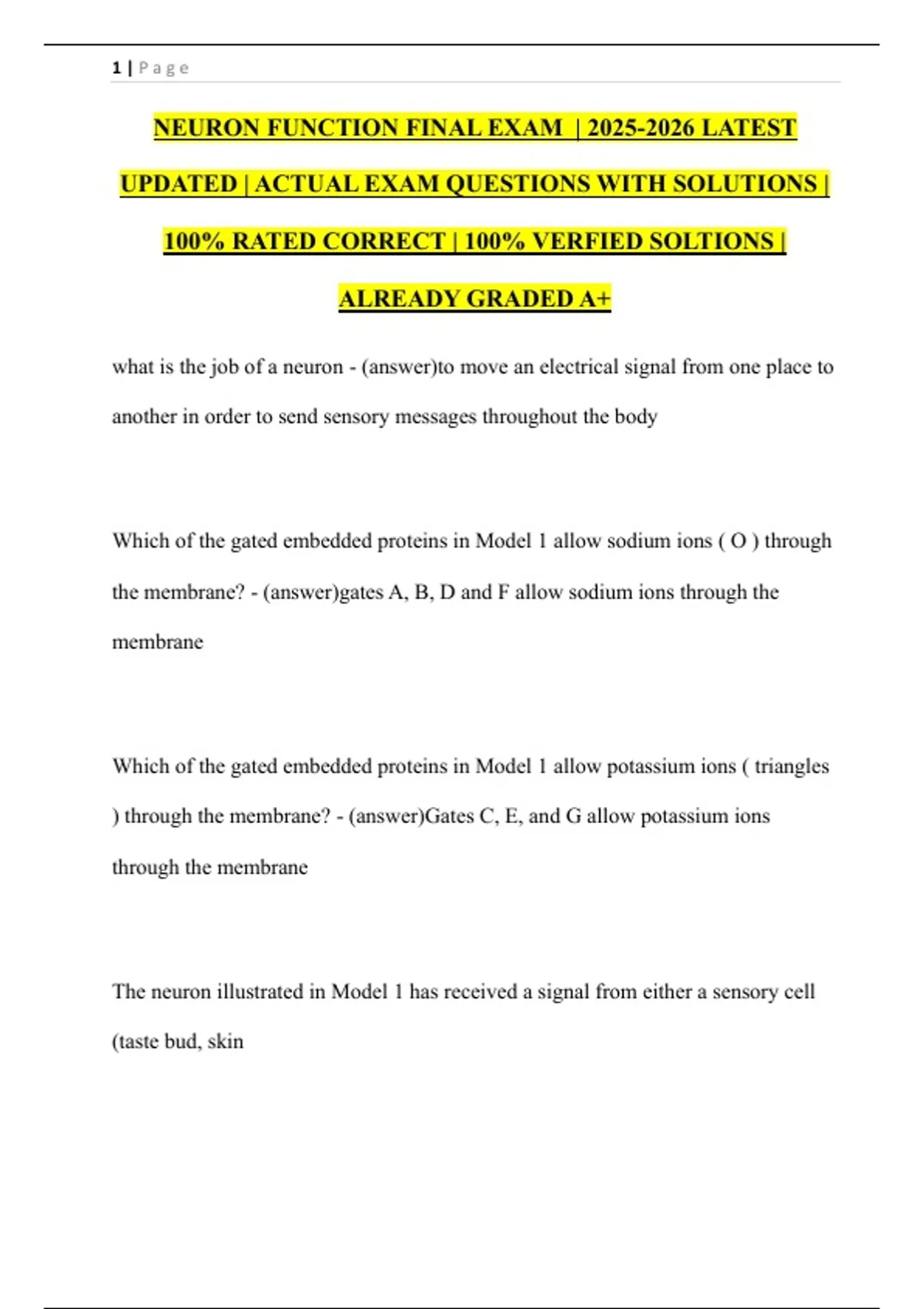 NEURON FUNCTION FINAL EXAM | LATEST UPDATED | ACTUAL EXAM QUESTIONS WITH SOLUTIONS | 100% RATED CORRECT | 100% VERFIED SOLTIONS | ALREADY GRADED A+