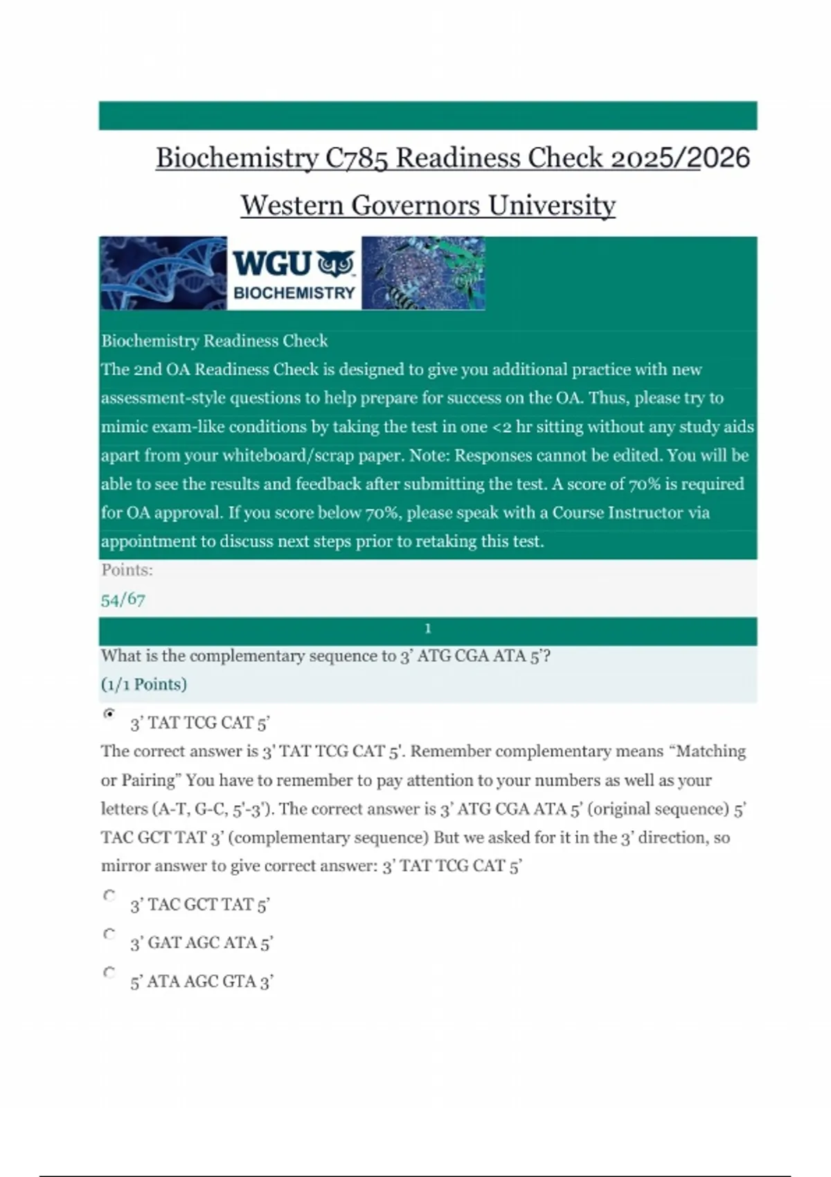 Biochemistry C785 Readiness Check 2025/2026 Western Governors University Biochemistry Readiness Check The 2nd OA Readiness Check is designed to give you additional practice with new assessment-style questions to help prepare for success on the OA. Thus, please try to mimic exam-like conditions by taking the test in one <2 hr sitting without any study aids apart from your whiteboard/scrap paper. Note: Responses cannot be edited. You will be able to see the results and feedback after submitting the test. A score of 70% is required for OA approval. If you score below 70%, please speak with a Course Instructor via appointment to discuss next steps prior to retaking this test. Points: 54/67 1 What is the complementary sequence to 3’ ATG CGA ATA 5’? (1/1 Points) 3’ TAT TCG CAT 5’ The correct answer is 3' TAT TCG CAT 5'. Remember complementary means “Matching or Pairing” You have to remember to pay attention to your numbers as well as your letters (A-T, G-C, 5'-3'). The correct answer is 3’ ATG CGA ATA 5’ (original sequence) 5’ TAC GCT TAT 3’ (complementary sequence) But we asked for it in the 3’ direction, so mirror answer to give correct answer: 3’ TAT TCG CAT 5’ 3’ TAC GCT TAT 5’ 3’ GAT AGC ATA 5’ 5’ ATA AGC GTA 3’