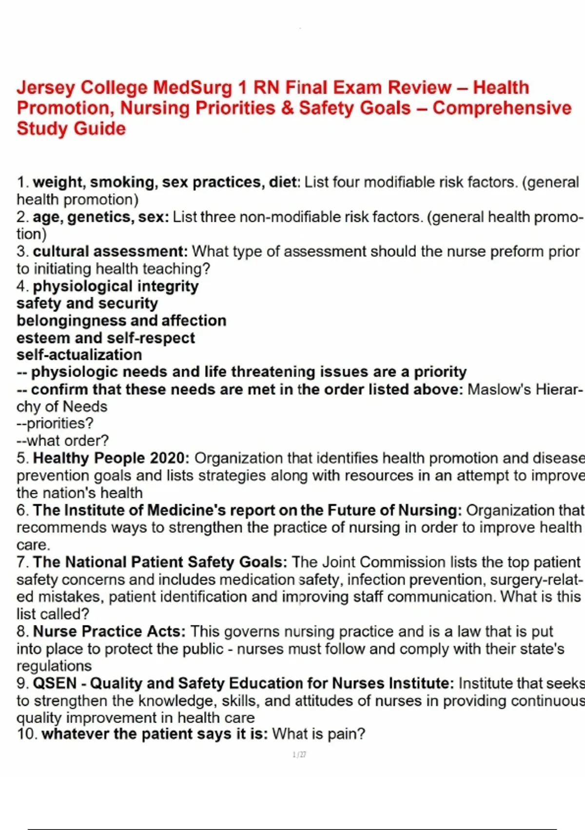 Jersey College MedSurg 1 RN Final Exam Review – Health Promotion, Nursing Priorities & Safety Goals – Comprehensive Study Guide.pdf