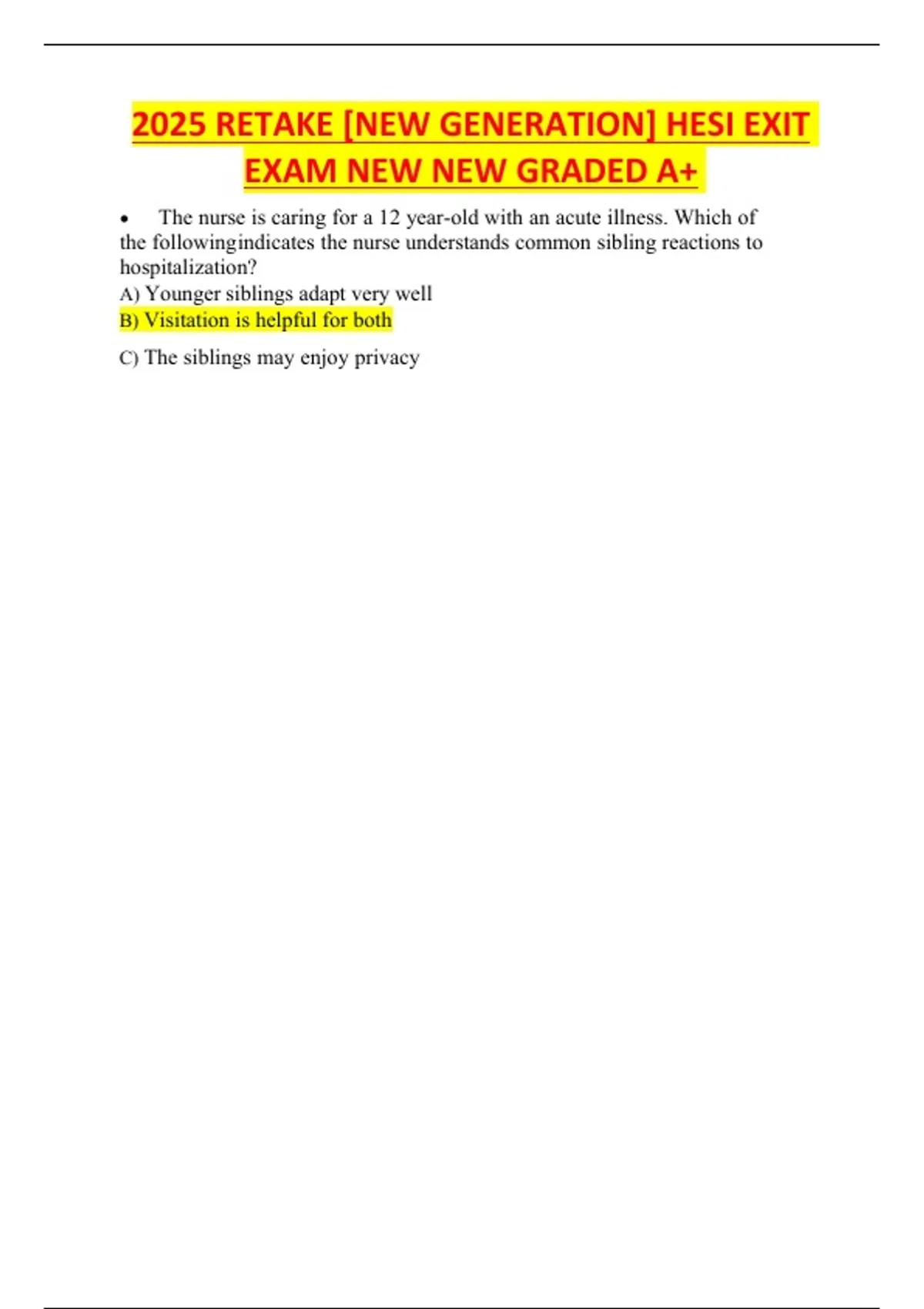 2025 RETAKE [NEW GENERATION] HESI EXIT EXAM NEW NEW GRADED A+ The nurse is caring for a 12 year-old with an acute illness. Which of the following indicates the nurse understands common sibling reactions to hospitalization? A)Younger siblings adapt very well B)Visitation is helpful for both C)The siblings may enjoy privacy D)Those cared for at home cope better The correct answer is B: Visitation is helpful for both