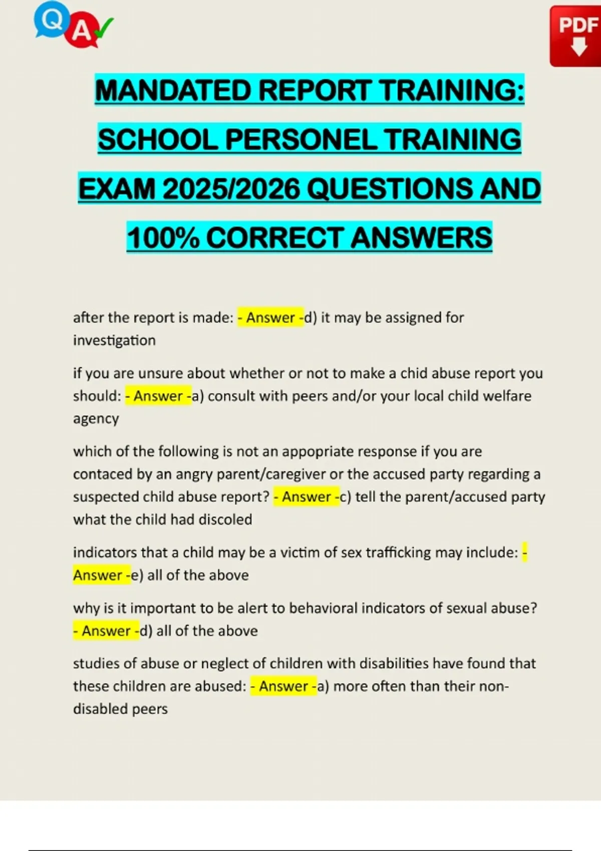 MANDATED REPORT TRAINING: SCHOOL PERSONEL TRAINING EXAM 2025/2026 QUESTIONS AND 100% CORRECT ANSWERS after the report is made: - Answer -d) it may be assigned for investigation if you are unsure about whether or not to make a chid abuse report you should: - Answer -a) consult with peers and/or your local child welfare agency which of the following is not an appopriate response if you are contaced by an angry parent/caregiver or the accused party regarding a suspected child abuse report? - Answer -c) tell the parent/accused party what the child had discoled