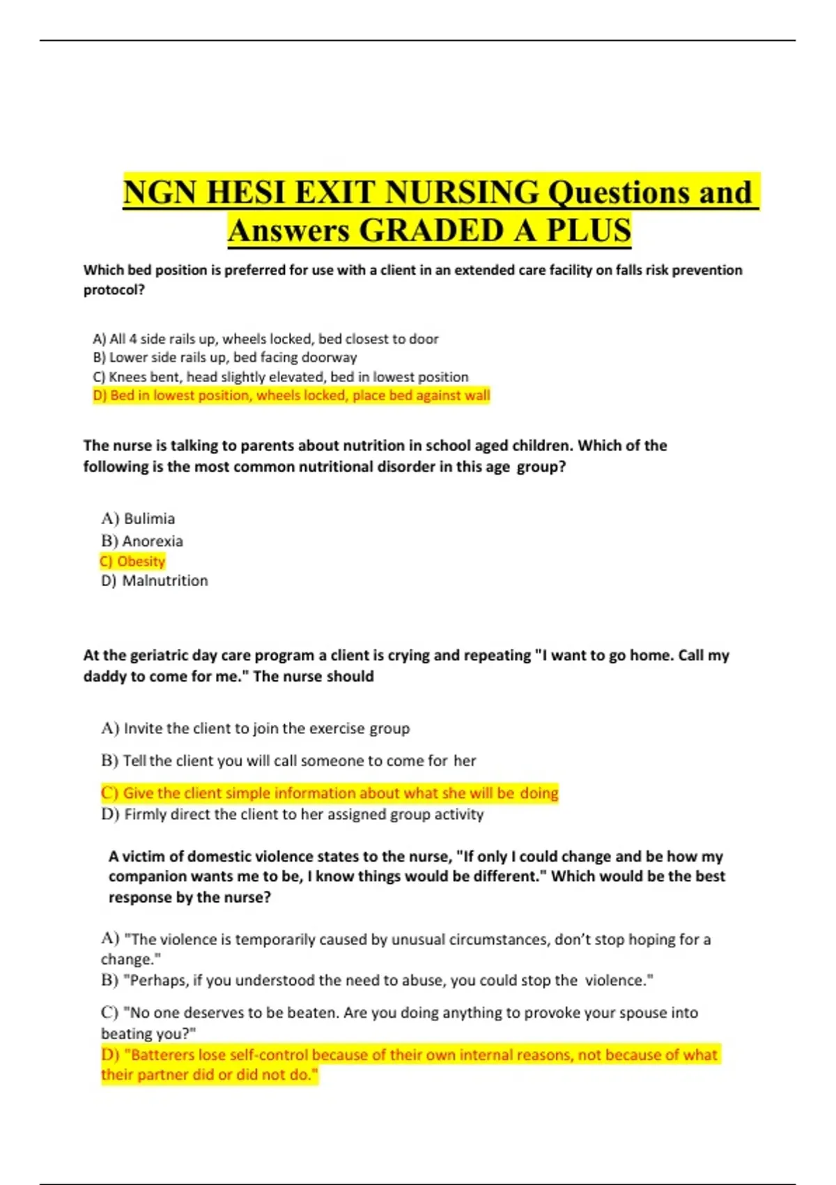NGN HESI EXIT NURSING Questions and Answers GRADED A PLUS