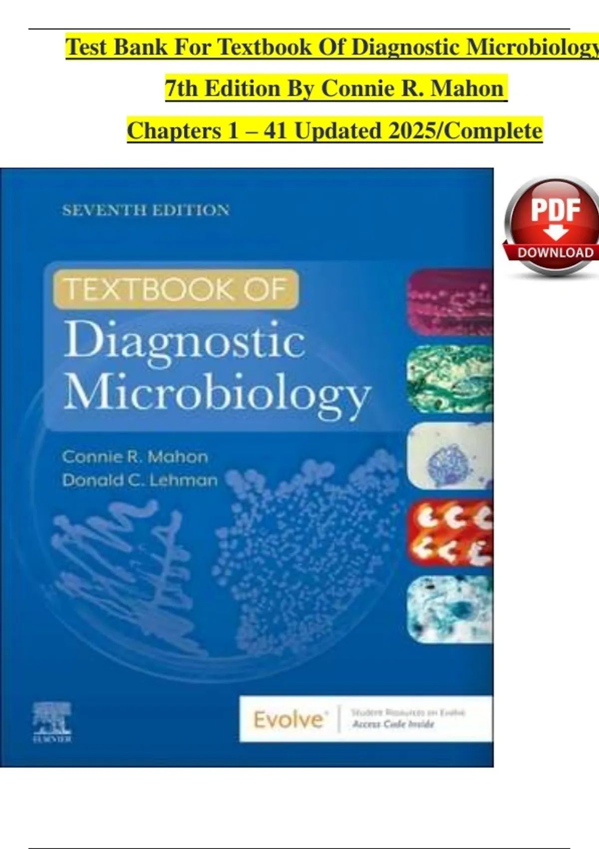 The Test Bank for the Textbook of Diagnostic Microbiology, 7th Edition by Connie R. Mahon is a comprehensive collection of exam-style questions designed to reinforce key concepts in clinical microbiology. It covers topics such as microbial identification, pathogenic mechanisms, diagnostic techniques, and laboratory procedures. The test bank supports mastery of material found in the main textbook, helping students prepare for exams by focusing on applied knowledge, critical thinking, and case-based scenarios relevant to diagnostic microbiology practice.