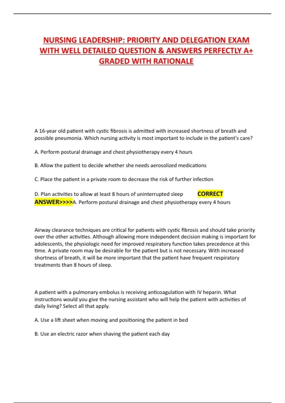 NURSING LEADERSHIP: PRIORITY AND DELEGATION EXAM
