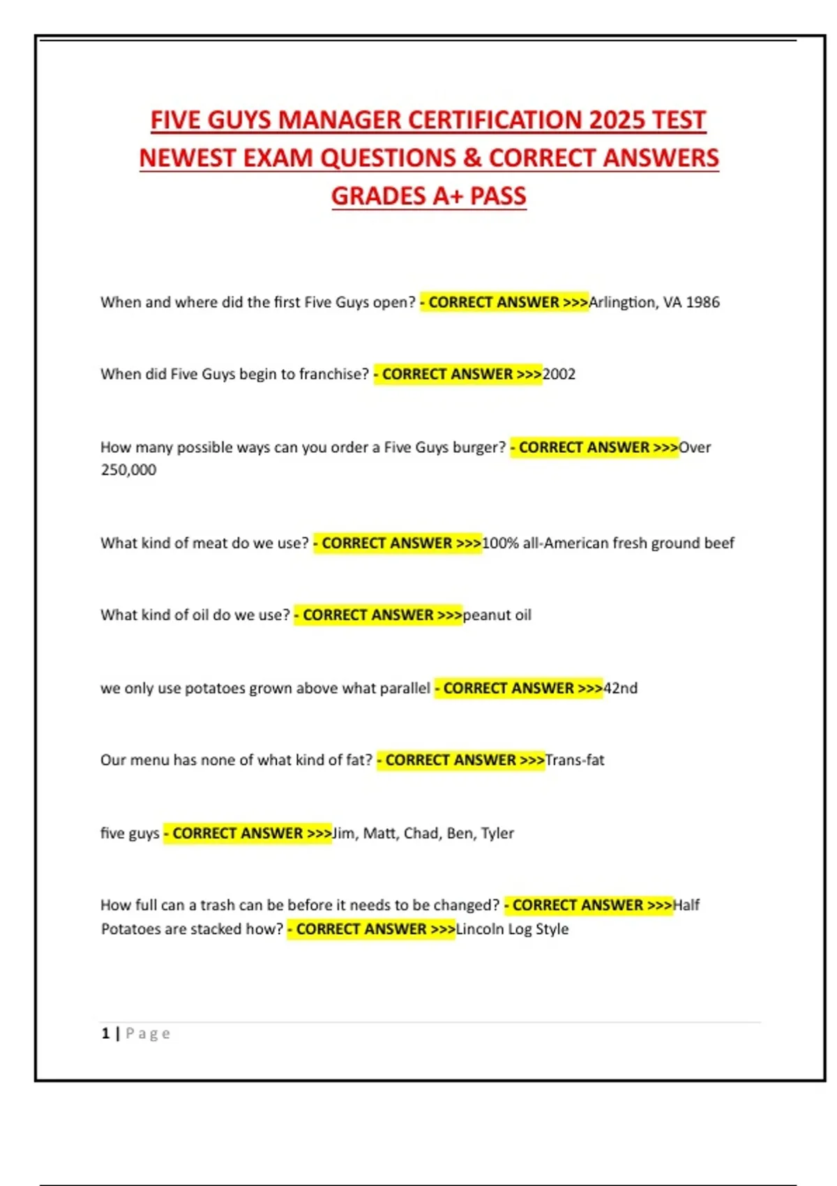FIVE GUYS MANAGER CERTIFICATION 2025 TEST NEWEST EXAM QUESTIONS & CORRECT ANSWERS GRADES A+ PASS FIVE GUYS MANAGER CERTIFICATION 2025 TEST NEWEST EXAM QUESTIONS & CORRECT ANSWERS GRADES A+ PASS