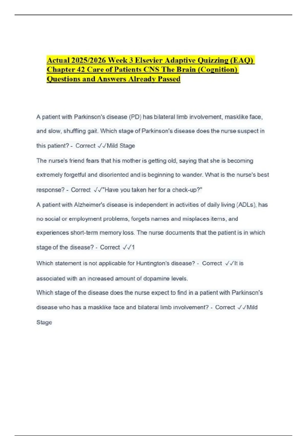 Actual 2025/2026 Week 3 Elsevier Adaptive Quizzing (EAQ) Chapter 42 Care of Patients CNS The Brain (Cognition) Questions and Answers Already Passed A patient with Parkinson's disease (PD) has bilateral limb involvement, masklike face, and slow, shuffling gait. Which stage of Parkinson's disease does the nurse suspect in this patient? - Correct Mild Stage The nurse's friend fears that his mother is getting old, saying that she is becoming extremely forgetful and disoriented and is beginning to wander. What is the nurse's best response? - Correct "Have you taken her for a check-up?" A patient with Alzheimer's disease is independent in activities of daily living (ADLs), has no social or employment problems, forgets names and misplaces items, and experiences short-term memory loss. The nurse documents that the patient is in which stage of the disease? - Correct 1