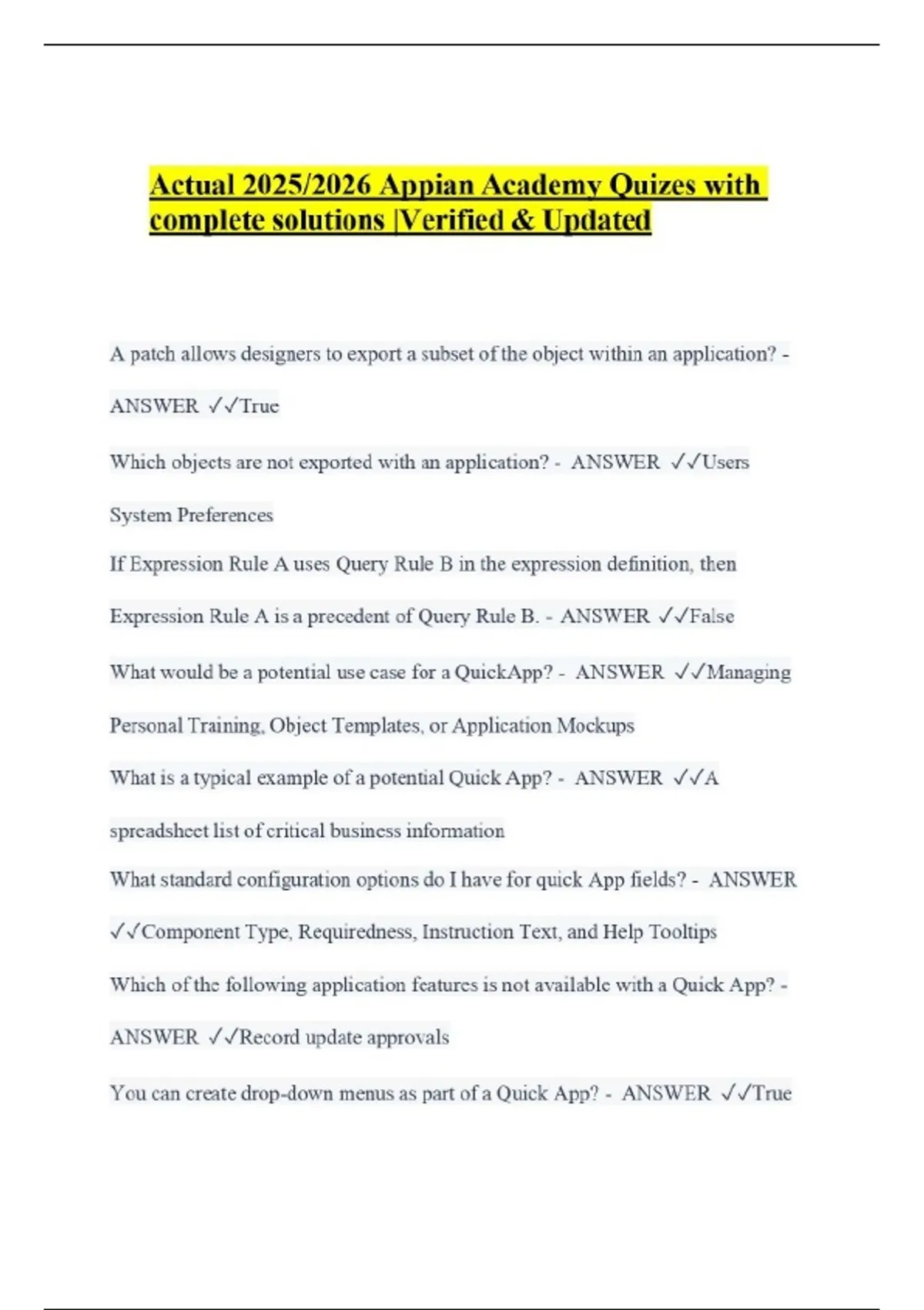 Actual 2025/2026 Appian Academy Quizes with complete solutions |Verified & Updated A patch allows designers to export a subset of the object within an application? - ANSWER True Which objects are not exported with an application? - ANSWER Users System Preferences If Expression Rule A uses Query Rule B in the expression definition, then Expression Rule A is a precedent of Query Rule B. - ANSWER False What would be a potential use case for a QuickApp? - ANSWER Managing Personal Training, Object Templates, or Application Mockups What is a typical example of a potential Quick App? - ANSWER A spreadsheet list of critical business information What standard configuration options do I have for quick App fields? - ANSWER Component Type, Requiredness, Instruction Text, and Help Tooltips Which of the following application features is not available with a Quick App? - ANSWER Record update approvals You can create drop-down menus as part of a Quick App? - ANSWER True
