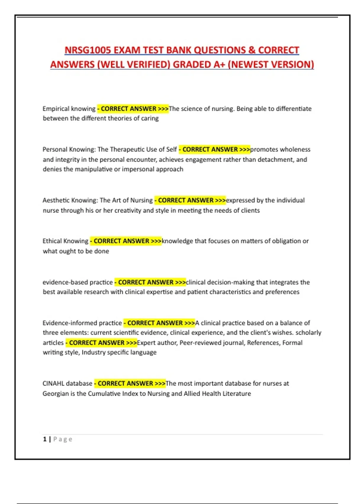 NRSG1005 EXAM TEST BANK QUESTIONS & CORRECT ANSWERS (WELL VERIFIED) GRADED A+ (NEWEST VERSION) NRSG1005 EXAM TEST BANK QUESTIONS & CORRECT ANSWERS (WELL VERIFIED) GRADED A+ (NEWEST VERSION) NRSG1005 EXAM TEST BANK QUESTIONS & CORRECT ANSWERS (WELL VERIFIED) GRADED A+ (NEWEST VERSION)