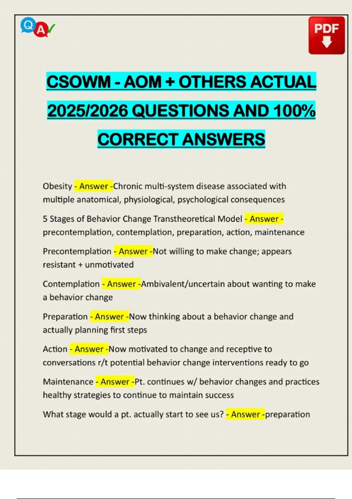 CSOWM - AOM + OTHERS ACTUAL 2025/2026 QUESTIONS AND 100% CORRECT ANSWERS Obesity - Answer -Chronic multi-system disease associated with multiple anatomical, physiological, psychological consequences 5 Stages of Behavior Change Transtheoretical Model - Answer - precontemplation, contemplation, preparation, action, maintenance Precontemplation - Answer -Not willing to make change; appears resistant + unmotivated Contemplation - Answer -Ambivalent/uncertain about wanting to make a behavior change Preparation - Answer -Now thinking about a behavior change and actually planning first steps Action - Answer -Now motivated to change and receptive to conversations r/t potential behavior ch